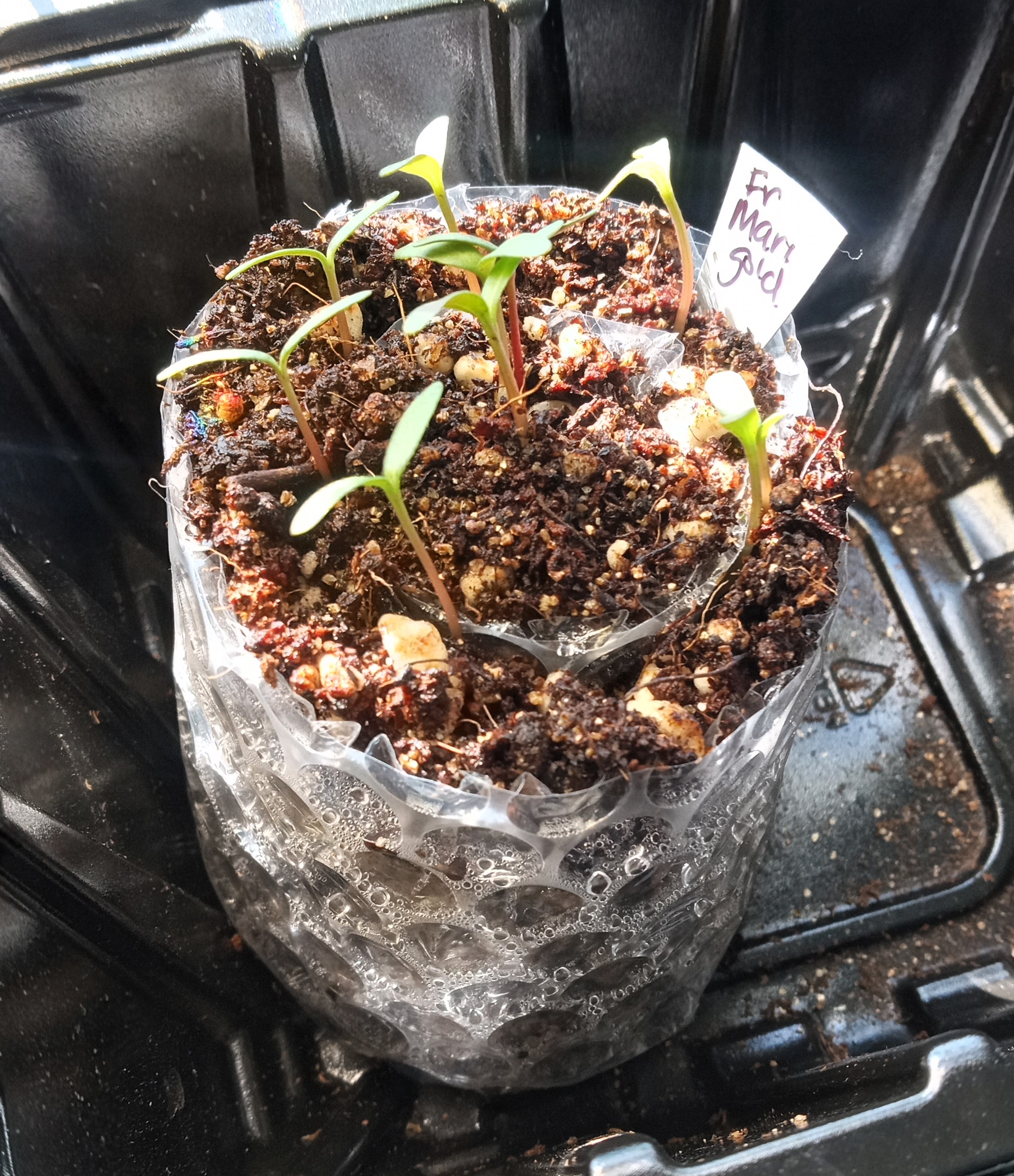 One new technique I’ve run across is a bubble wrap sprouting coil. Huh? (I can’t remember who or what or where I saw it so I can’t give proper credit here.) You take a strip of bubble wrap, add a smaller strip of paper towel, and then a layer of seed starter. You place the seeds you are planting at the top of the wrap and wind it up. I used tape to keep it shut, and it has worked fine. The moisture, the warmth of the insulating bubble wrap equals success. I have quite a few marigold sprouts growing. When they are larger, I will unwind the strip and plant them in separate containers. This was so much fun to try and is perfect for those of us who don’t have a lot of windowsill room. Search through boxes for old bubble wrap, or, as I did, buy a small roll at the dollar store.