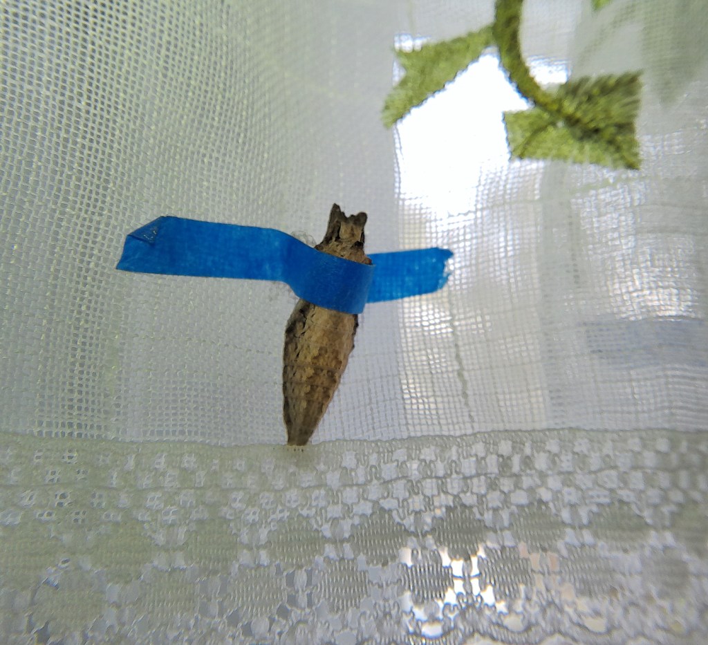 The snow cover and extra cold weather this year have been hard on songbirds too. I’ve thrown seed out onto the snow, and it is soon devoured. I stopped using my feeders when there were rumors of the Bird Flu and haven’t put out any more suet since then. We have a very smart wren who can swoop under our back porch door a bit like a cat slinking through a tight space. I suddenly noticed that four of the eight Black Swallowtail chrysalides that were over-wintering on the porch had disappeared. Nearby were bird droppings. We are assuming the wren feasted on the missing chrysalides. To save the four still on the porch, I brought them into the house and taped them to a curtain so they would get the proper amount of outside light. I am hoping they do not emerge too soon.