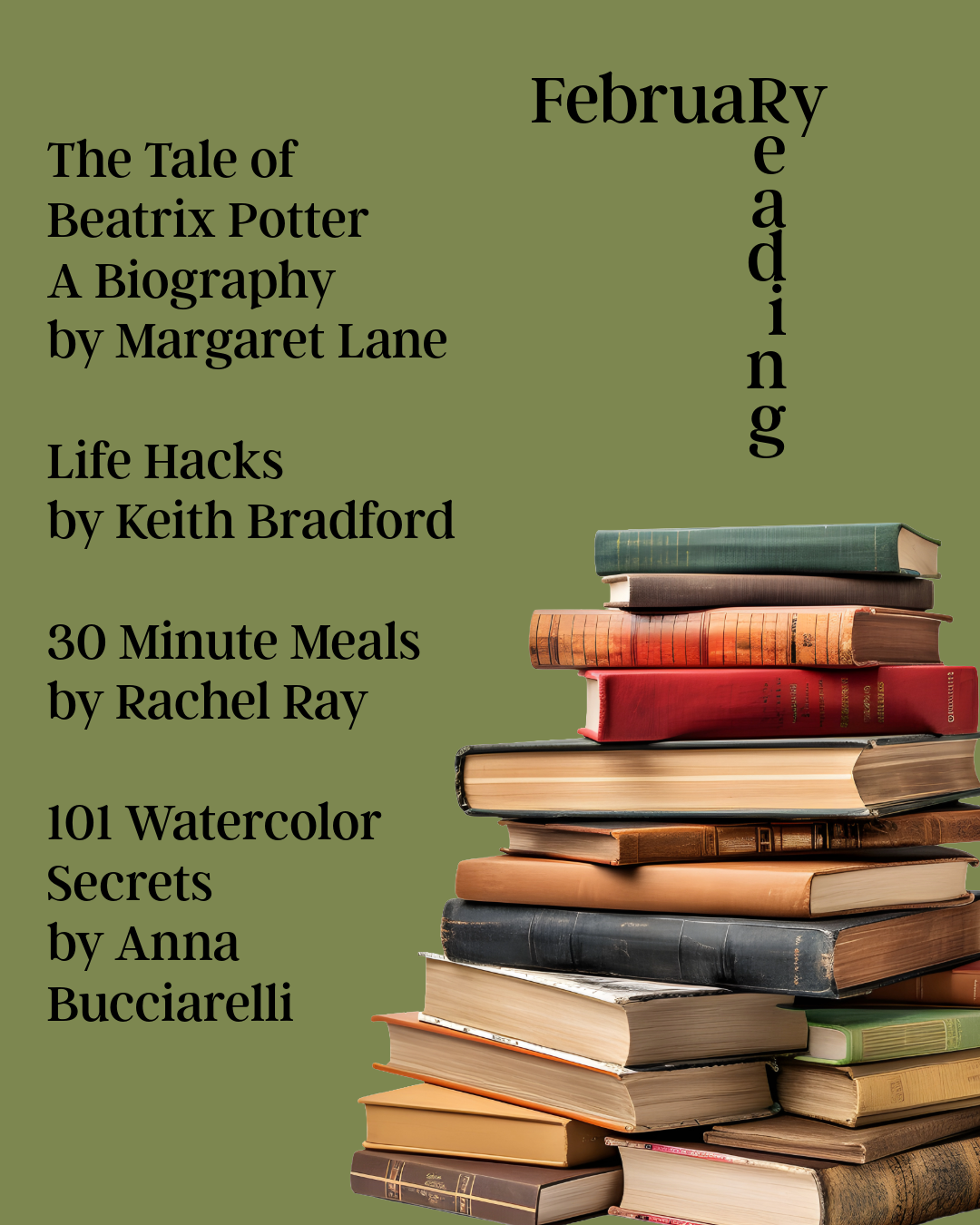 Life Hacks by Keith Bradford is exactly what its title implies: good tips for everyday problems. I found several new recipes in 30 Minute Meals by Rachel Ray that look promising. I always like to add a new recipe or two to my files each month.
