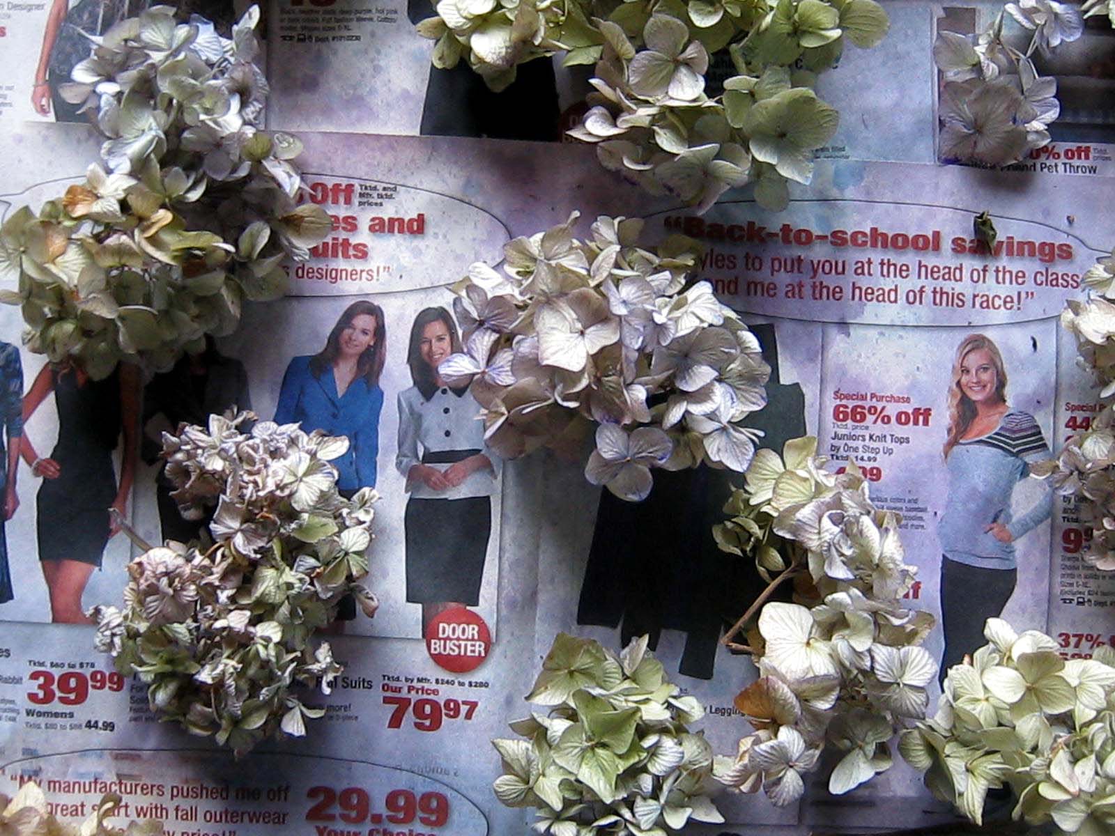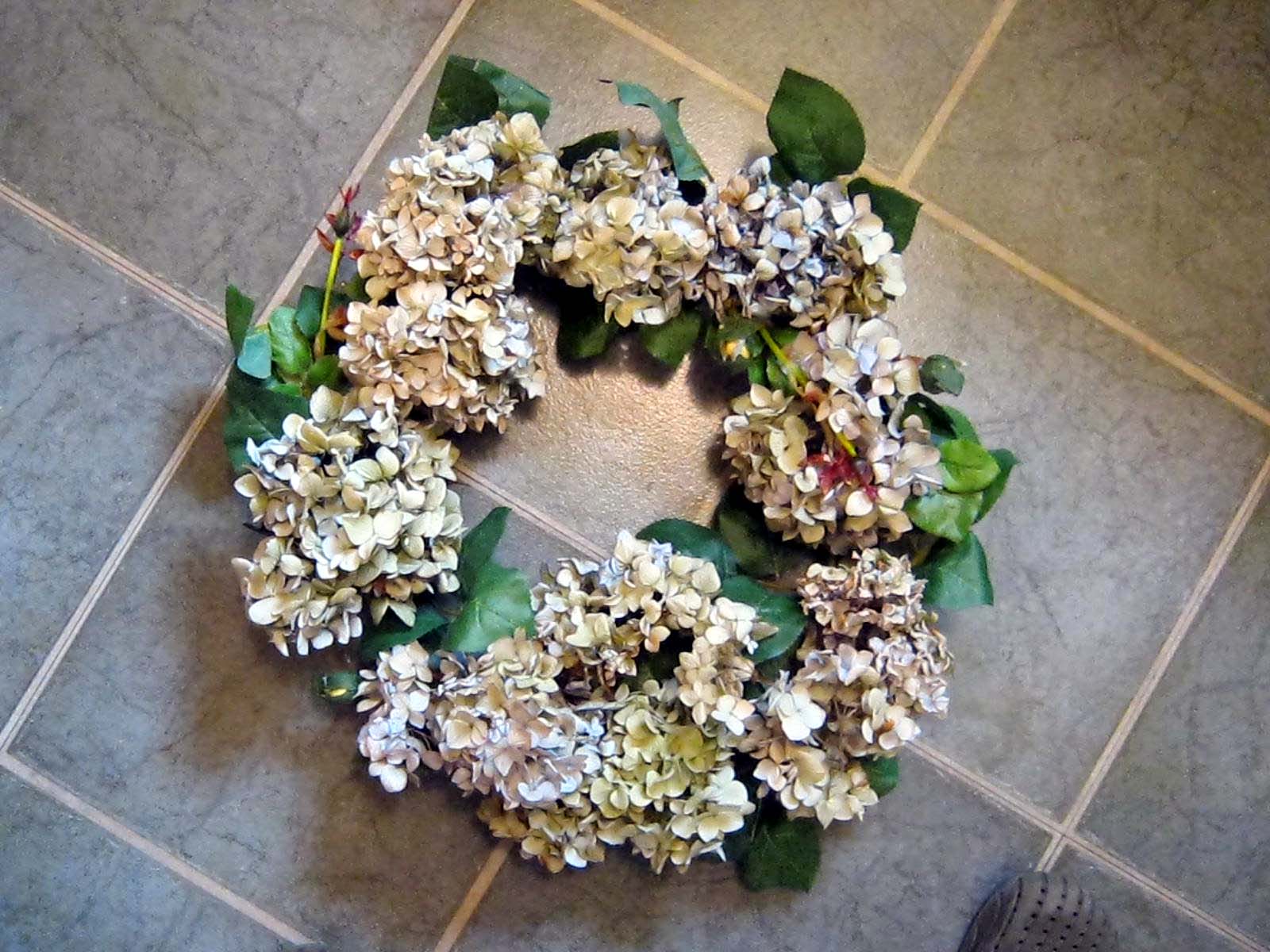 The next step was to pour the pint/hair spray mixture back into the pump bottle. (Don’t use a recycled spray bottle, such as Windex, etc., as the spray is too heavy and the droplets are very large.) I covered the garage floor with newspaper and laid my dried hydrangeas out in a single layer. I sprayed the petals with the Cobalt Blue mix. Eureka! The thin mist of tinted hairspray worked as I intended, enhancing the colors already present on the petals. Next, I added a bit of Cobalt Blue and Alizarin Crimson to the second mix, a soft lavender/pink. I sprayed a quick coat of this on the flowers. Yes…they blended perfectly. Within a day, they were dry. I hot-glued the hydrangeas to a wreath and hung it on the wall. The natural colors will still begin to fade at some point, as all dried flowers tend to do, but this year the enhancement of the acrylics will keep them looking vibrant for a while longer.