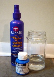 I bought a pump-bottle hair spray I knew was long-lasting and had a pleasant fragrance. (Aussie Brand) Your wreath will remind you of a hair salon for a few weeks, so be sure the smell of the hairspray you choose is not something you find repellent. An unscented spray will also work. Next, I divided the spray into two jars. Into these jars, I added cobalt blue acrylic paint, a few drops will do, and in the second jar, a mix of cobalt blue/alizarin crimson paint to create a lavender. I use Golden Taklon Soft Body acrylic, but any brand that provides decent coverage and is not too thick would work. Tube acrylics are not an option for this. I put the lid on the jar and shook it for about thirty seconds to ensure that the hairspray and paint were well incorporated.