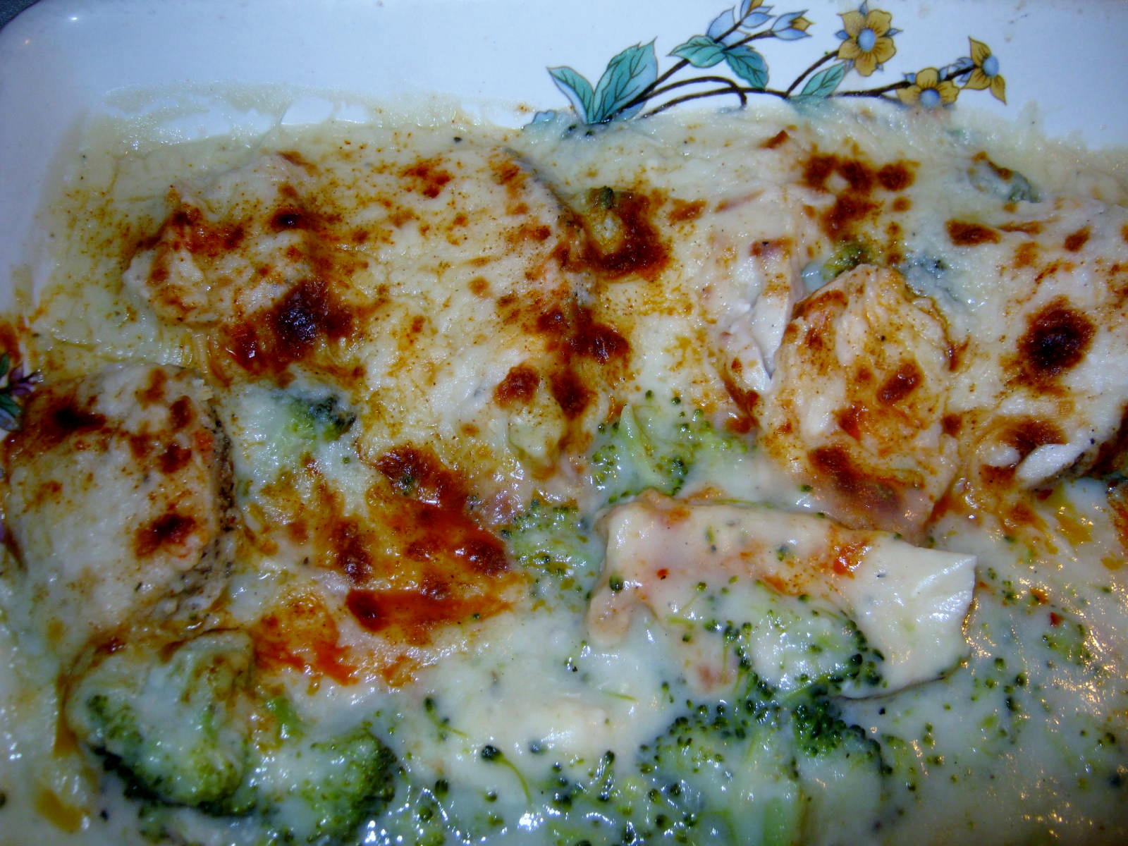 Arrange broccoli in flameproof low edged casserole dish, Top with half the sauce. Stir 1/4 cup cheese mixture into remaining sauce. Arrange chicken on broccoli, pour remaining sauce on top and sprinkle the remaining quarter cup of cheese on top.