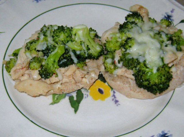 Put a dollop of mayo mix on muffin, spread it out, heap chicken on muffin, cover chicken with broccoli florets, and sprinkle liberally with cheese. Toast until cheese is melted. This is so easy and so delicious. Any leftovers heat up easily in the microwave the next day.