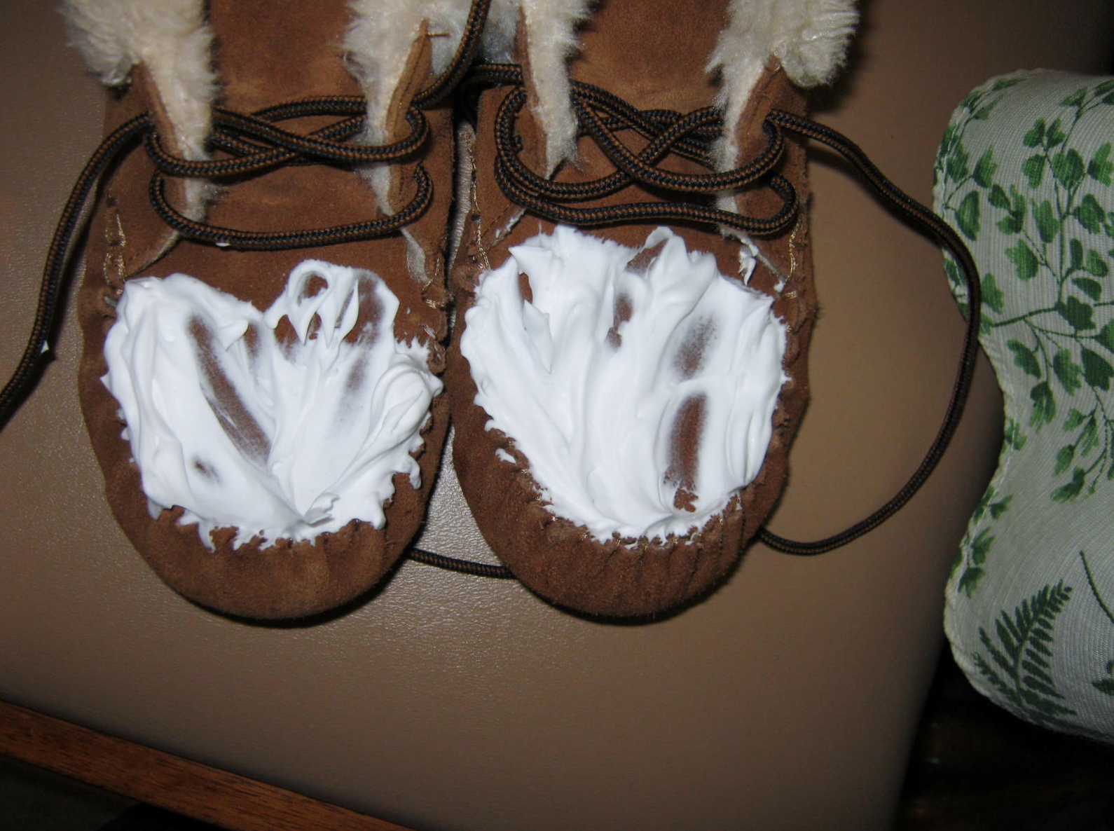 I covered the soiled areas on both slippers with a layer of shaving cream and let it sit for a few minutes. I then rubbed it in with a damp washcloth and let it sit a bit longer. In about a half hour I cleaned off any leftover residue and let the slippers dry.