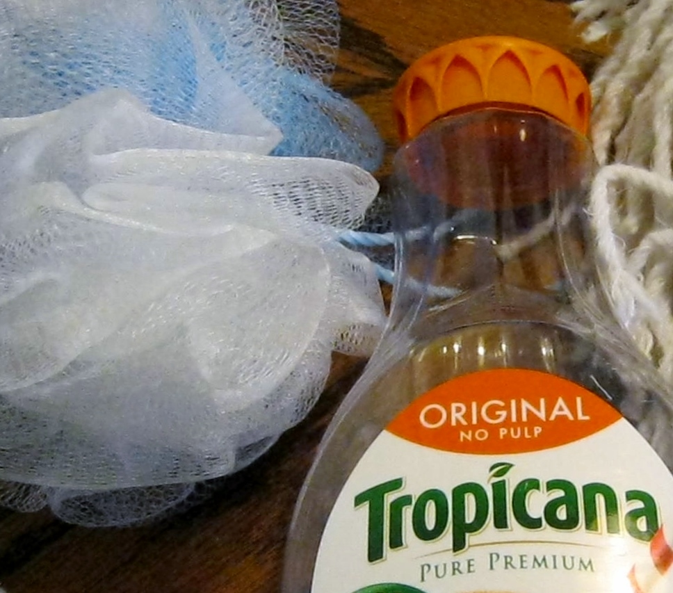 To begin, I gathered together a few of the empty juice containers I have been saving. Since I prefer milk cartons for outdoor winter sowing, I have at least two dozen or more juice containers cleaned and ready to use. I also rounded up an old net scubber, rubber bands, thick yarn, and of course seed starting medium.