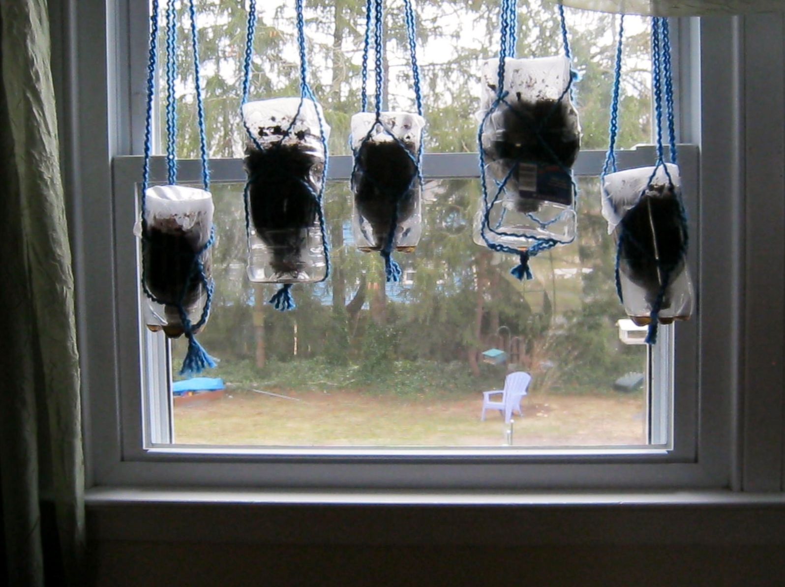 Using a skein of extra thick yarn, I fashioned rudimentary macrame plant hangers over my extra strength curtain rods and hung my gardens. Every time I see them silhouetted in my back window I smile. Hurry Spring!
