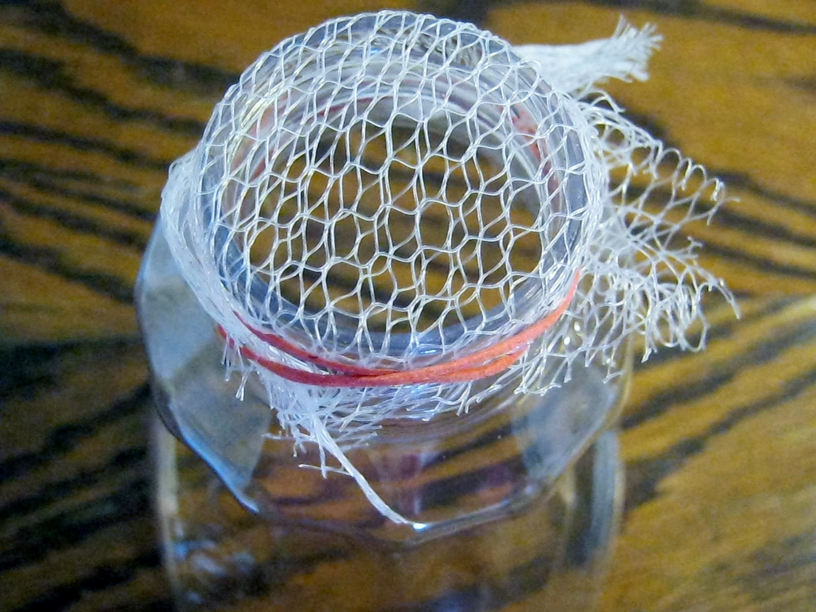 After cutting the juice bottle 1/3 up from the bottom, I was left with a good sized top section. I covered the top opening with a doubled up portion of netting and secured it in place with a rubber band.