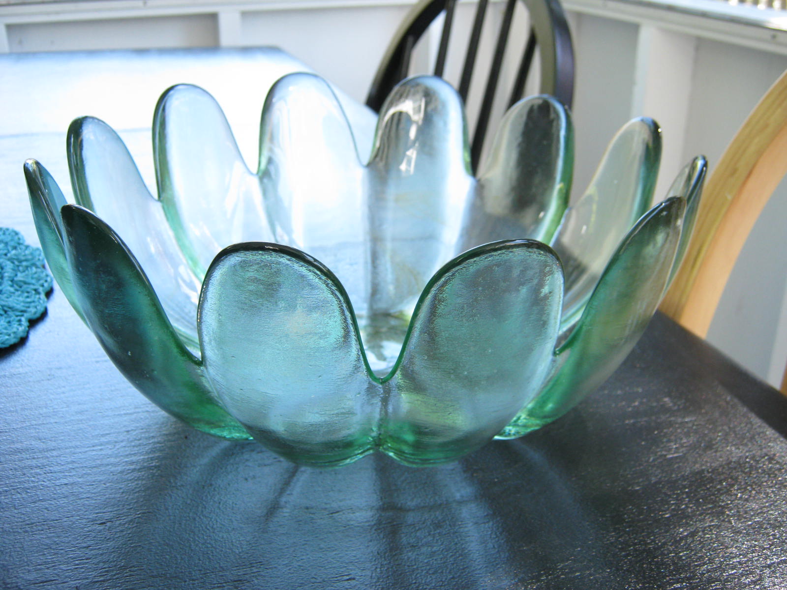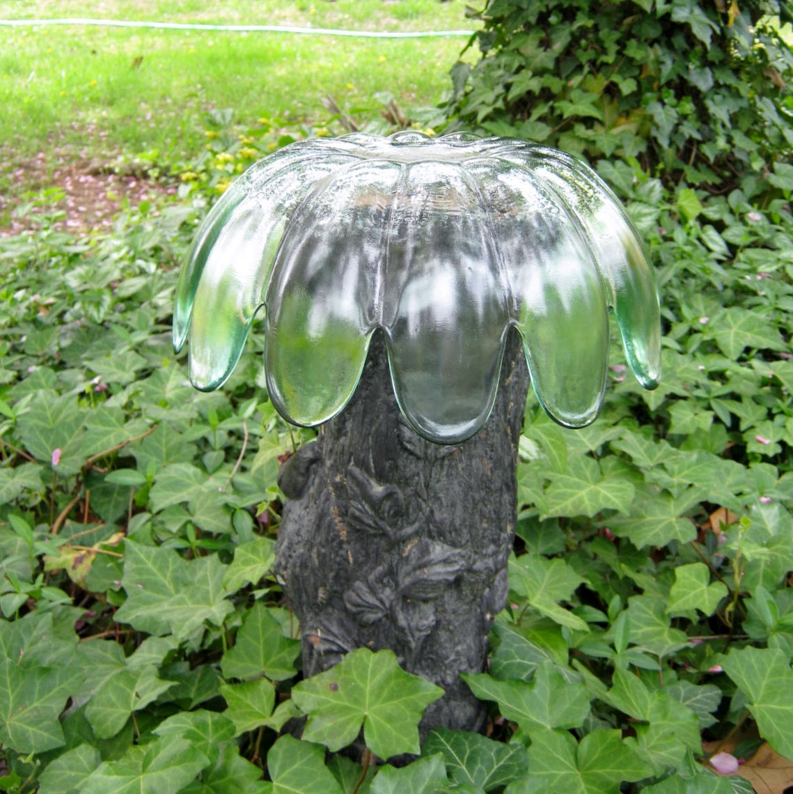 I found this interesting green bowl at a yard sale this past weekend. I was immediately taken by the color and the petal-like quality of it’s edges. I thought of the empty concrete stand in the ivy patch. It once held a lovely birdbath, and then a gazing ball. I had hoped to make something new out of it and finding this bowl helped me achieve my goal.