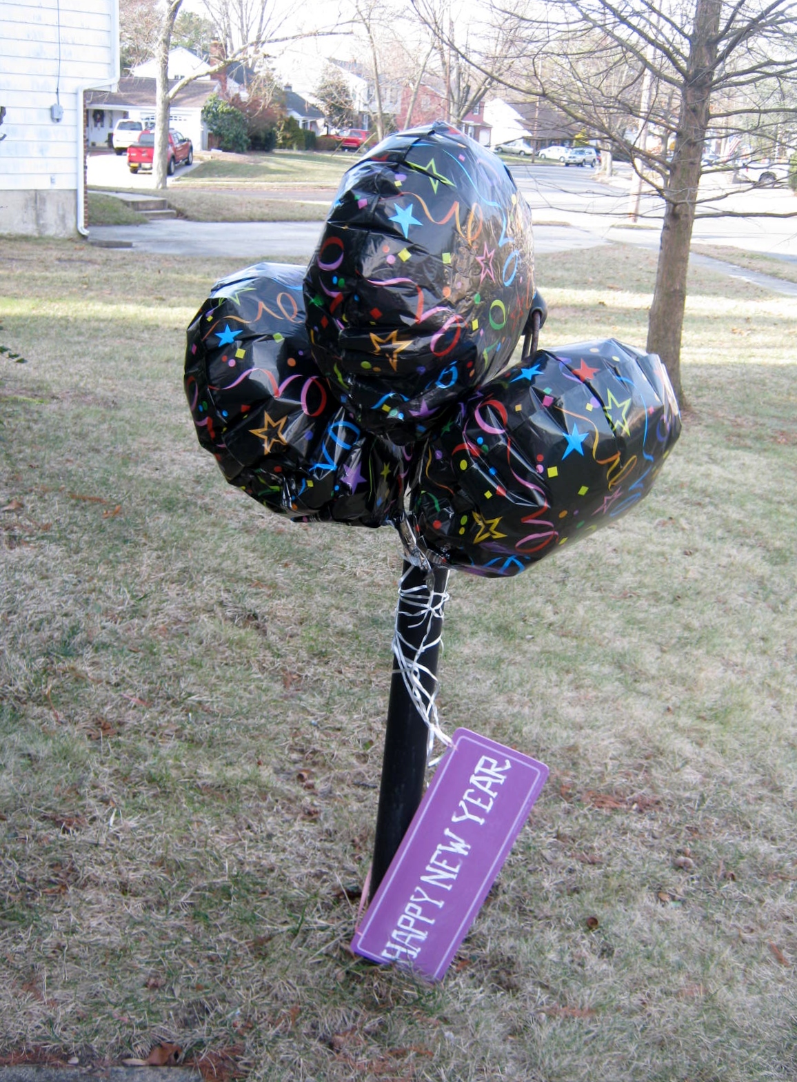 The balloons were flying high last night, the sign in place, I was pleased with my New Year’s greeting to the neighborhood. So…woke up this morning and the balloons were twisted and tangled around the hitching post, my sign was on the ground…oh well…”best laid plans…” they sometimes fail. I guess I didn’t take into account the strength of the winter wind. Oh well…started the year off with a laugh at being foiled again…HAPPY NEW YEAR TO ALL!!!