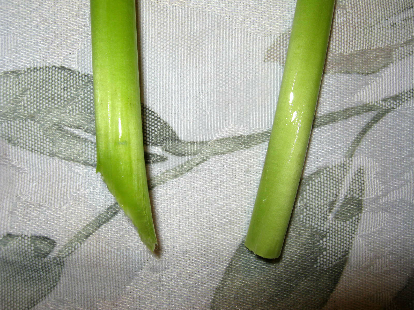 Cut your stems at an angle. If left flat the stem tends to lay flush against the vase or rocks making it harder for water to rise up to the flower. I also remove the lowest large leaves. These are often damaged by cutting and packaging and will sit below the water line, eventually decaying and spoiling the water.