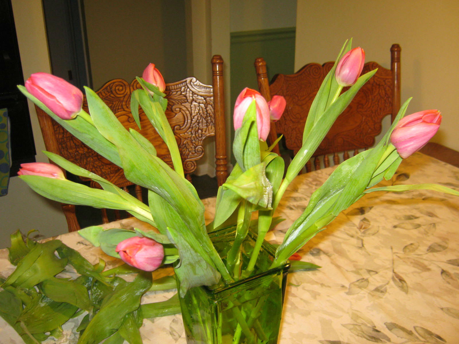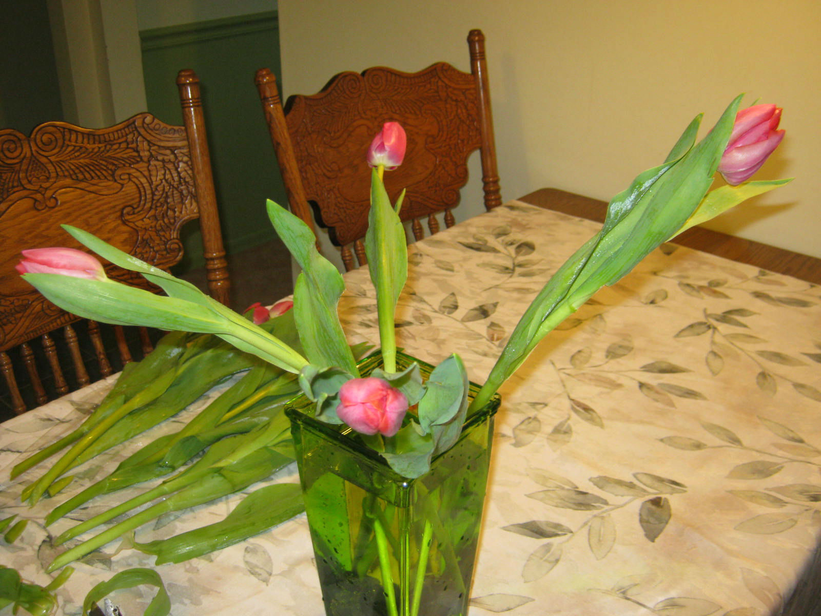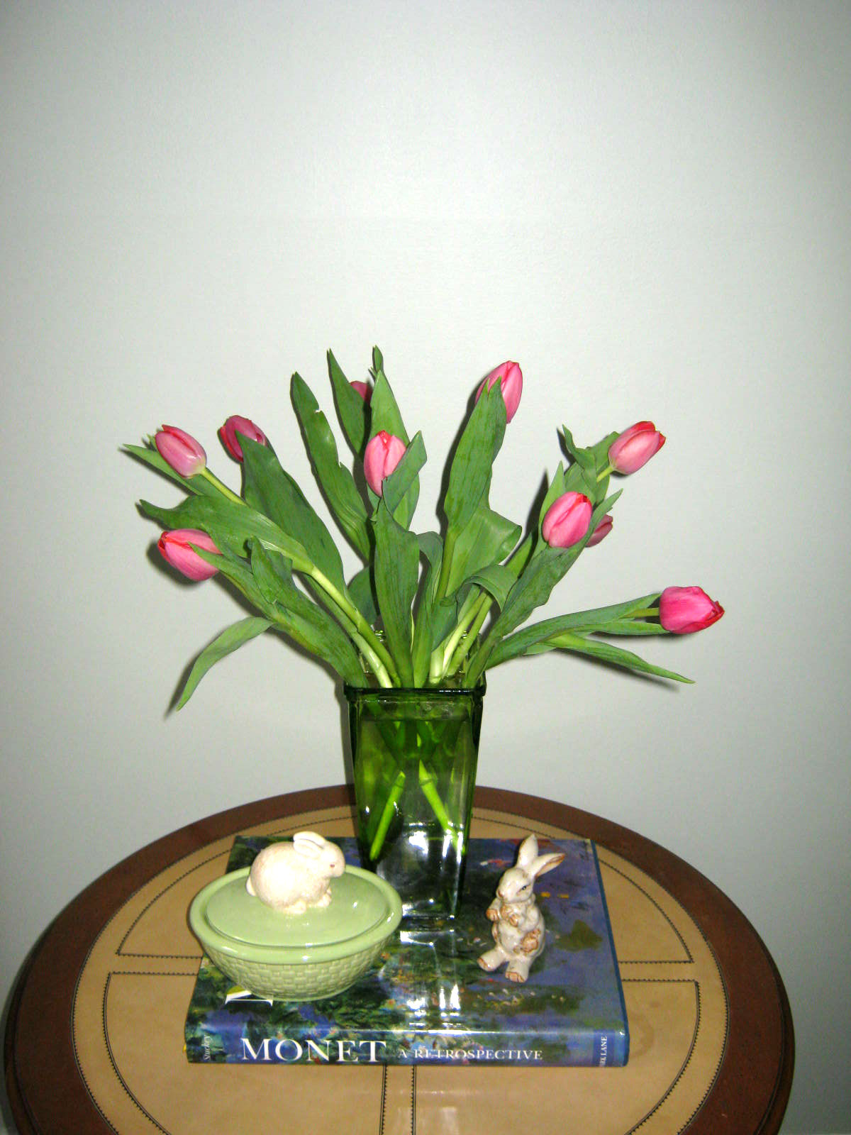 Work your way around the vase in a series of four. Second stem, opposite the first, third in between the first and second, fourth opposite the third. Begin the second four stems the same way, but this time place stem five between stem one and two. You will have nicely spaced tulips when you have completed inserting these eight stems. Your vase will also have aesthetic appeal as the stems nicely criss-cross in a pattern instead of looking shoved in willy-nilly.