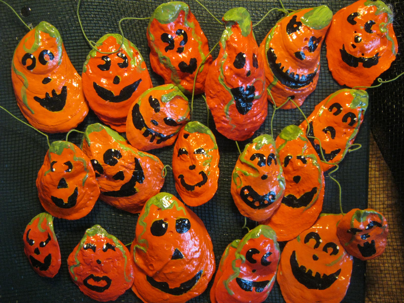 These sweet Jack-O-Lantern ornaments are created from common oyster shells picked up from local beaches.
