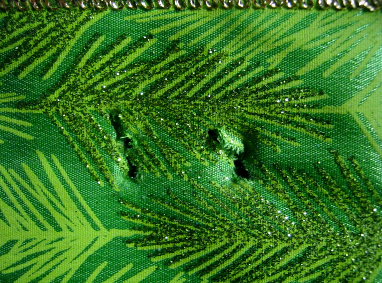 At this point I left the canvas alone for several hours to dry. When it was dry to the touch (watch those wet sides when you check it) I Crafted A Bow and tied it off with a piece of floral wire. (I had thirty feet of ribbon for this project) I ran two lengths of ribbon across the front to mimic a tied package. I stapled the ends of the ribbons behind the canvas on the wood stretcher bars, and then with a box cutter poked two holes where the ribbons crossed to insert the floral bow wire.