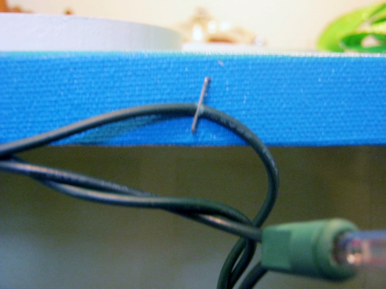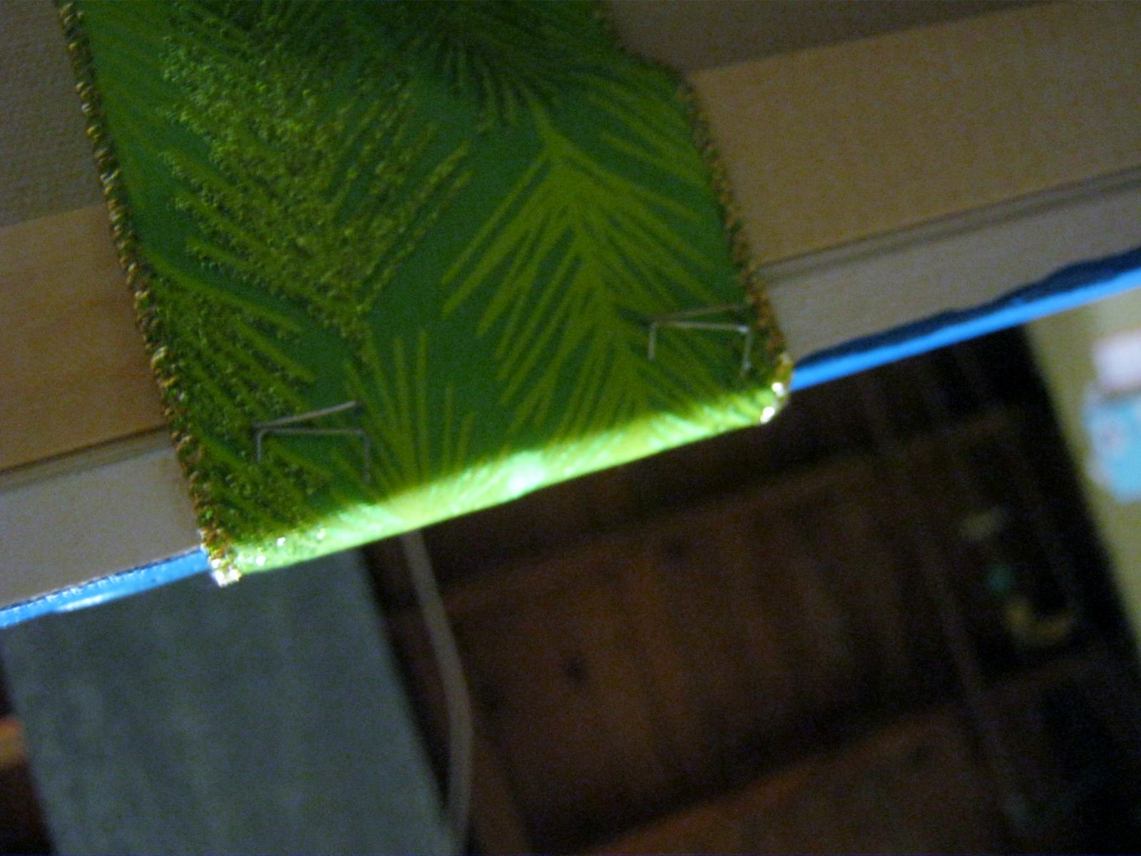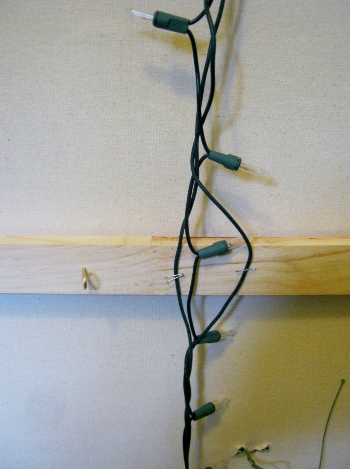 The next day, using the staple gun again, I attached a string of lights around the edge of the canvas. I had some extra, so I ran that bit up behind the canvas.