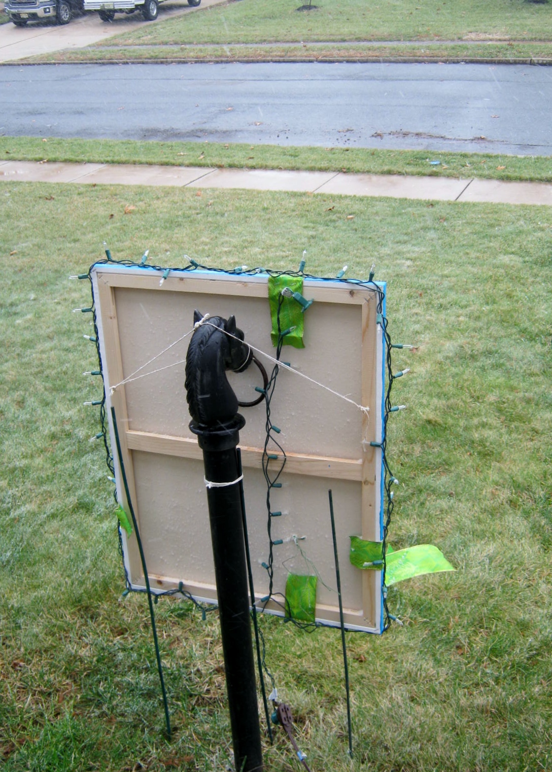 My final solution was the horse hitching post by my front porch. The sturdier, lower post was perfect for hanging. The ears and large pole formed a good anchor for many, many strings. Next year when I hang my canvas, I will think ahead and cover the back to hide the mechanics. But hey, the only people who will see the back are the mailman and those who leave my home. Hopefully, they will stay until dark and not notice!