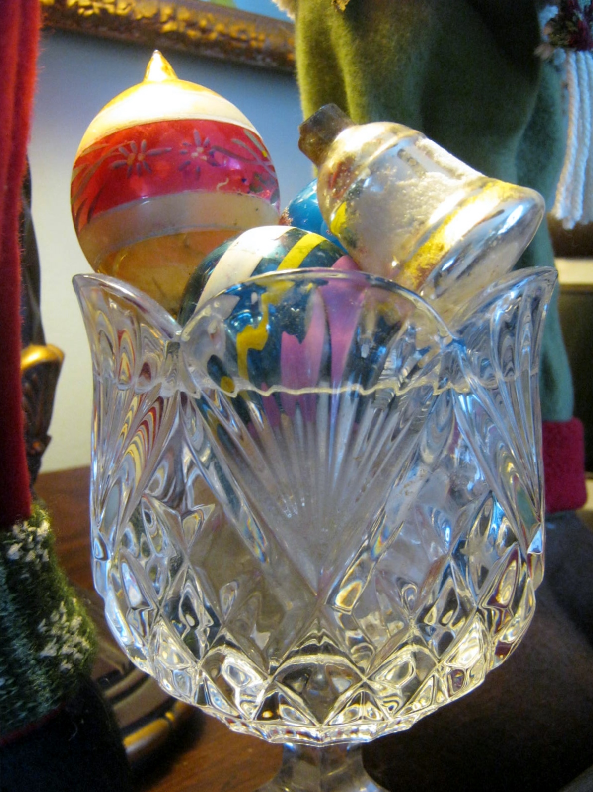 Vintage ornaments from my grandparent’s Christmas tree are displayed for the season, but also protected from inquisitive cats, in a crystal candy dish.