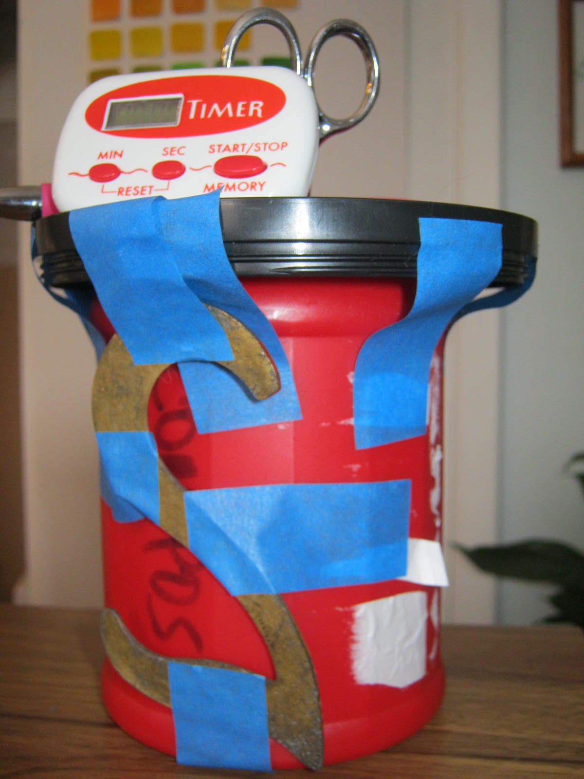 The boys love the bin of craft supplies in the basement. The bin is nothing more than a big container filled with recyclables I think hold creative promise. The younger grandson, in kindergarten, learning how to “create” and understand what a treasure is, put together a desk caddy for me from items in the bin. He presented his creation to me as I sat at my desk, his eyes shining with pride, and said, “Nanny, I know you will keep this forever.” Of course I will! Created out of an old coffee can and a CD holder, with loads of tape and an old brass number, it is a perfect receptacle for my pens and scissors.
