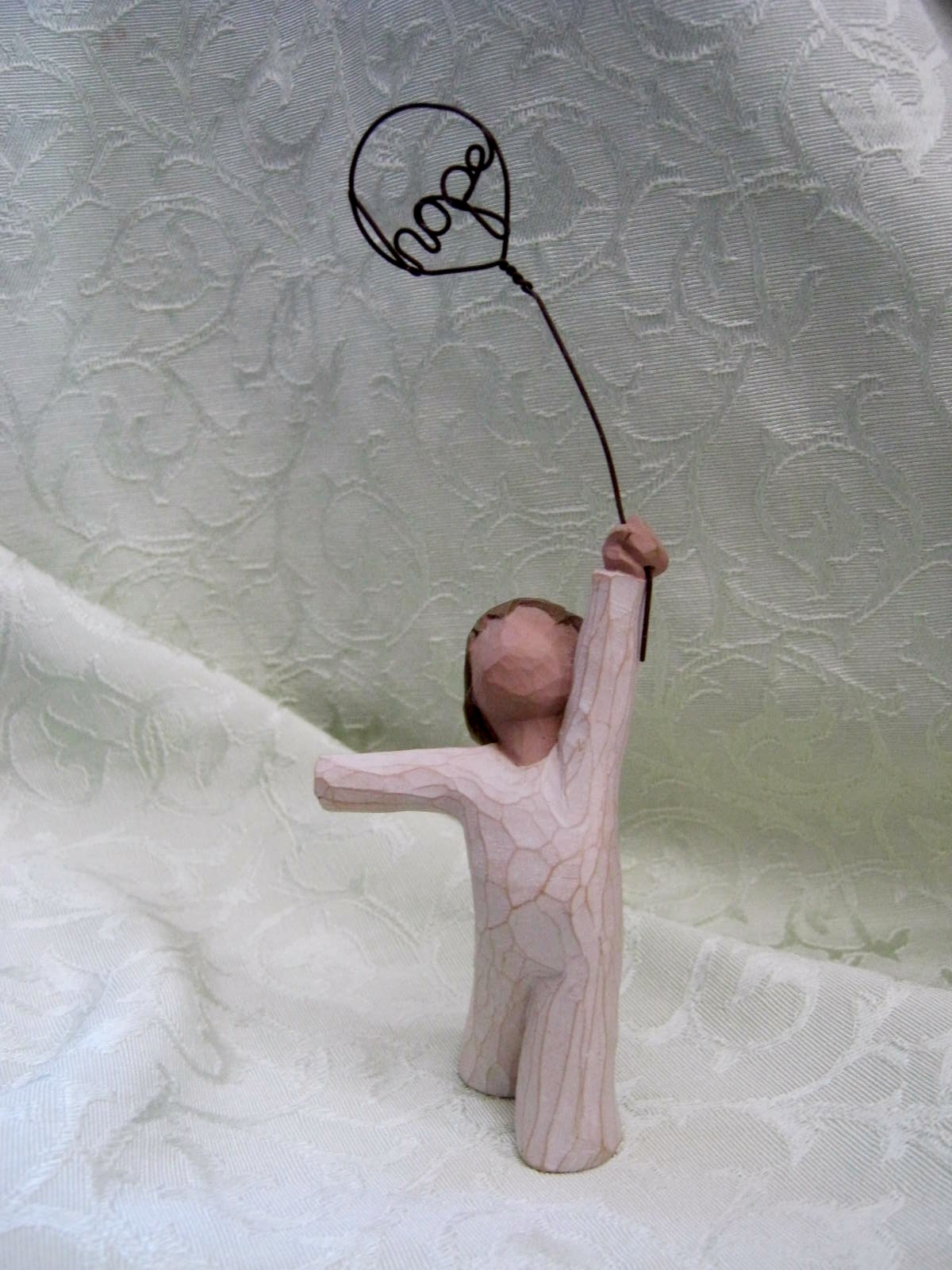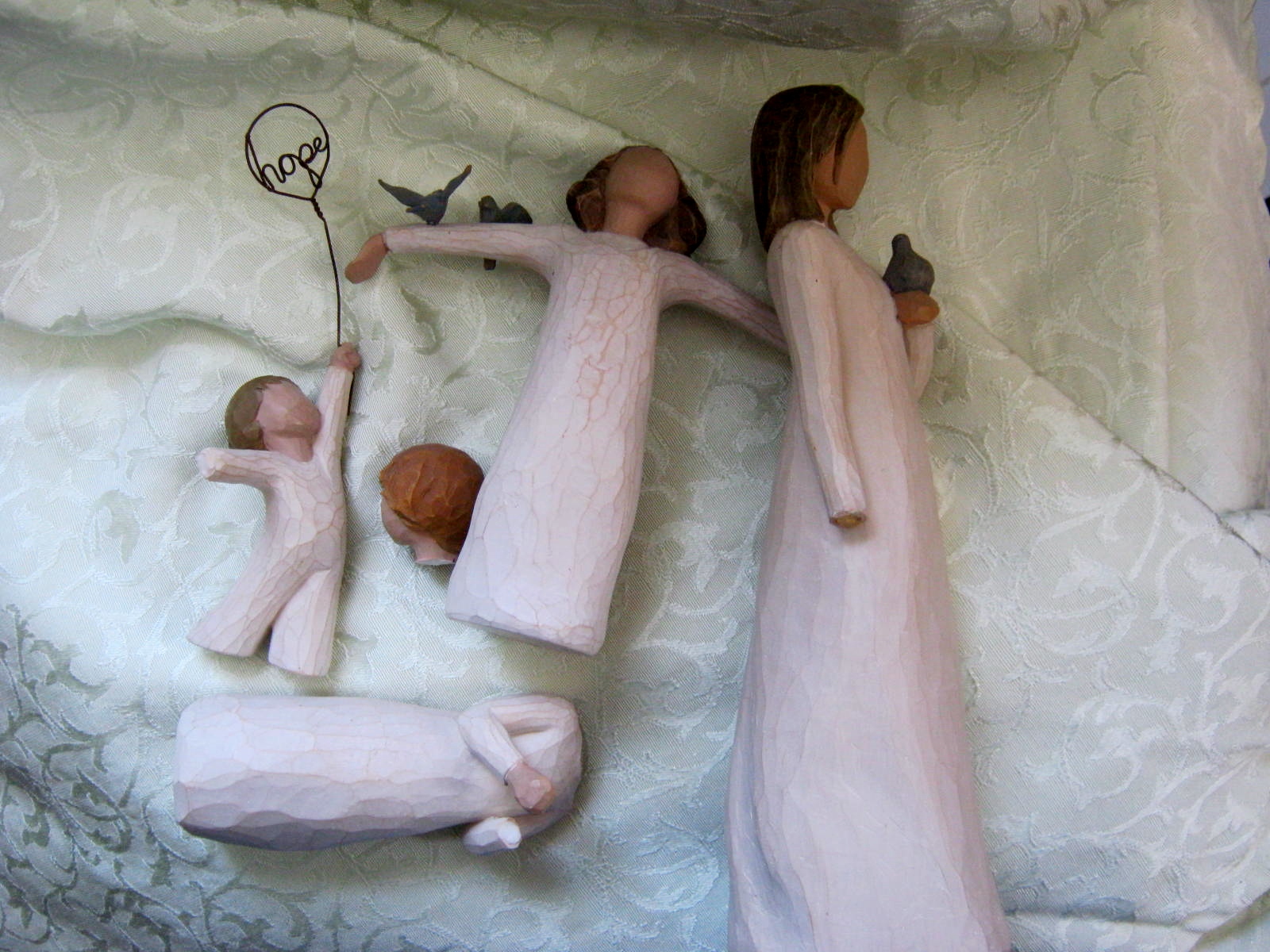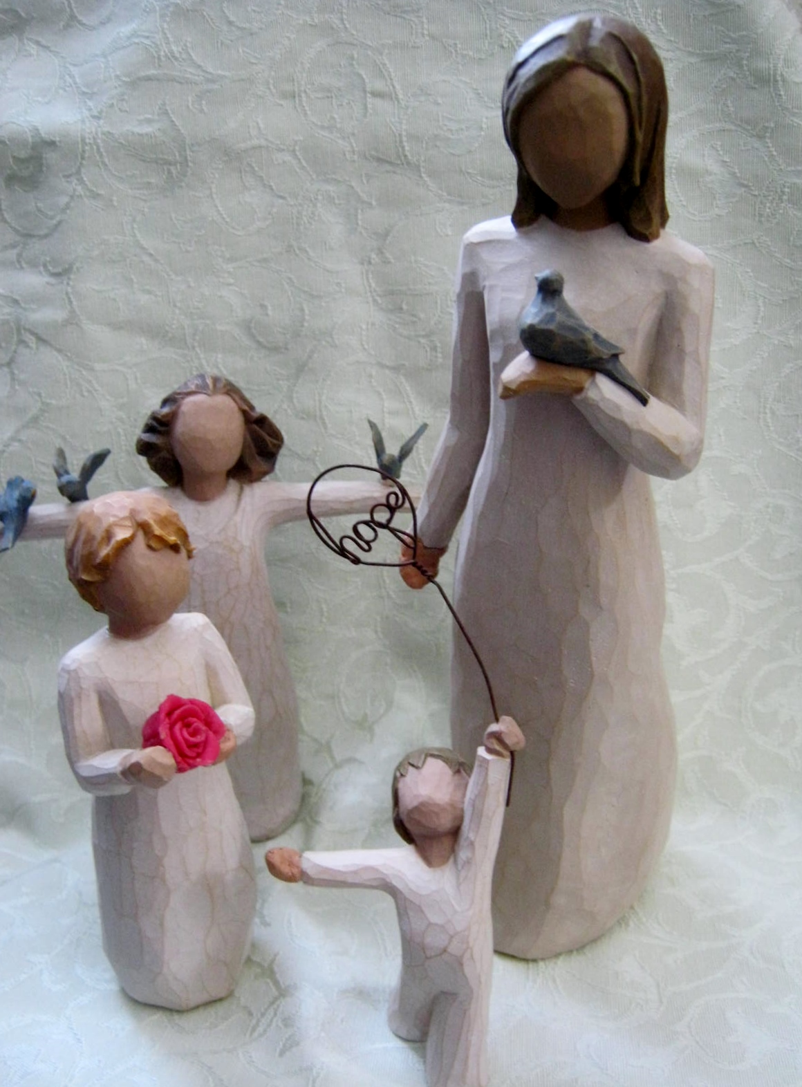 Willow Tree is a line of figurine sculptures created by artist “Susan Lordi in January 200. The Willow Tree line specializes in rustic faceless people and angels intended to represent feelings or life events. The figurines are made from hand-painted resin which is cast from Lordi’s hand-carved wooden sculptures.” ~ Wikipedia