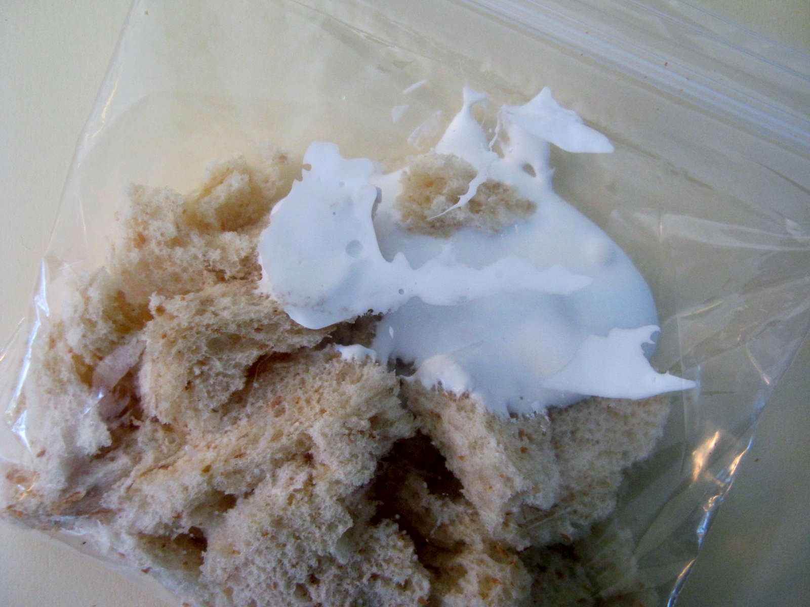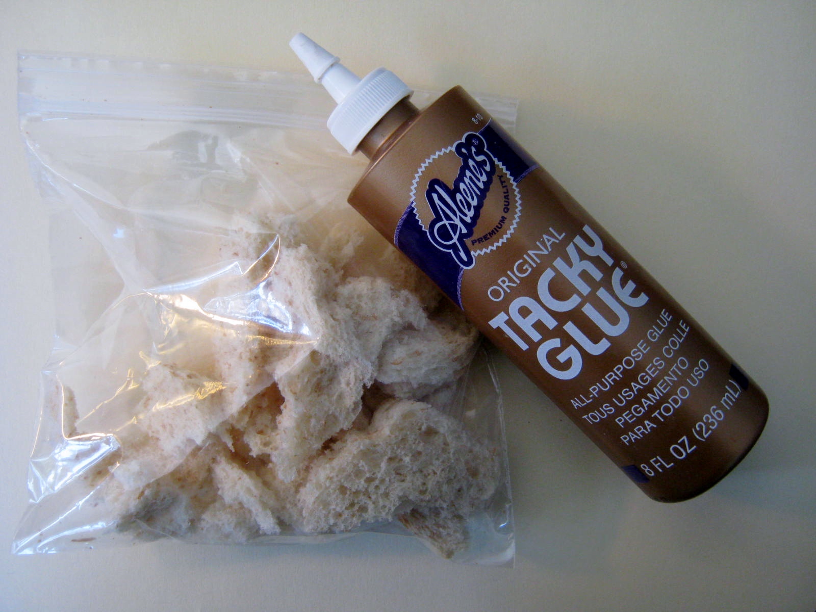 Break off the crusts from two pieces of bread. Tear the bread into pieces and place in a zip top sandwich bag. Next add two tablespoons of Aleene’s Original Tacky Glue and mush all this up.