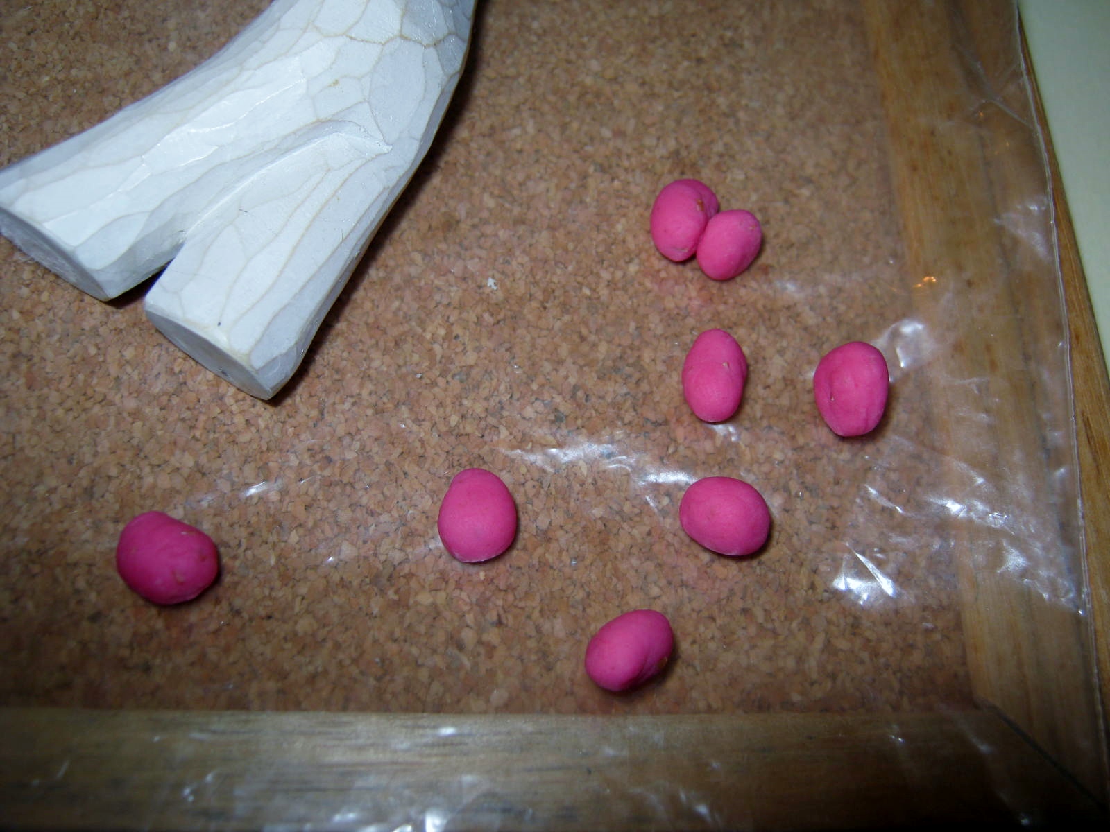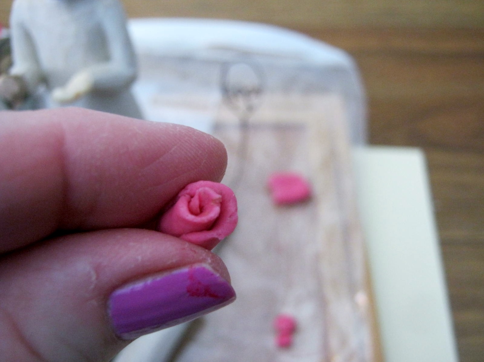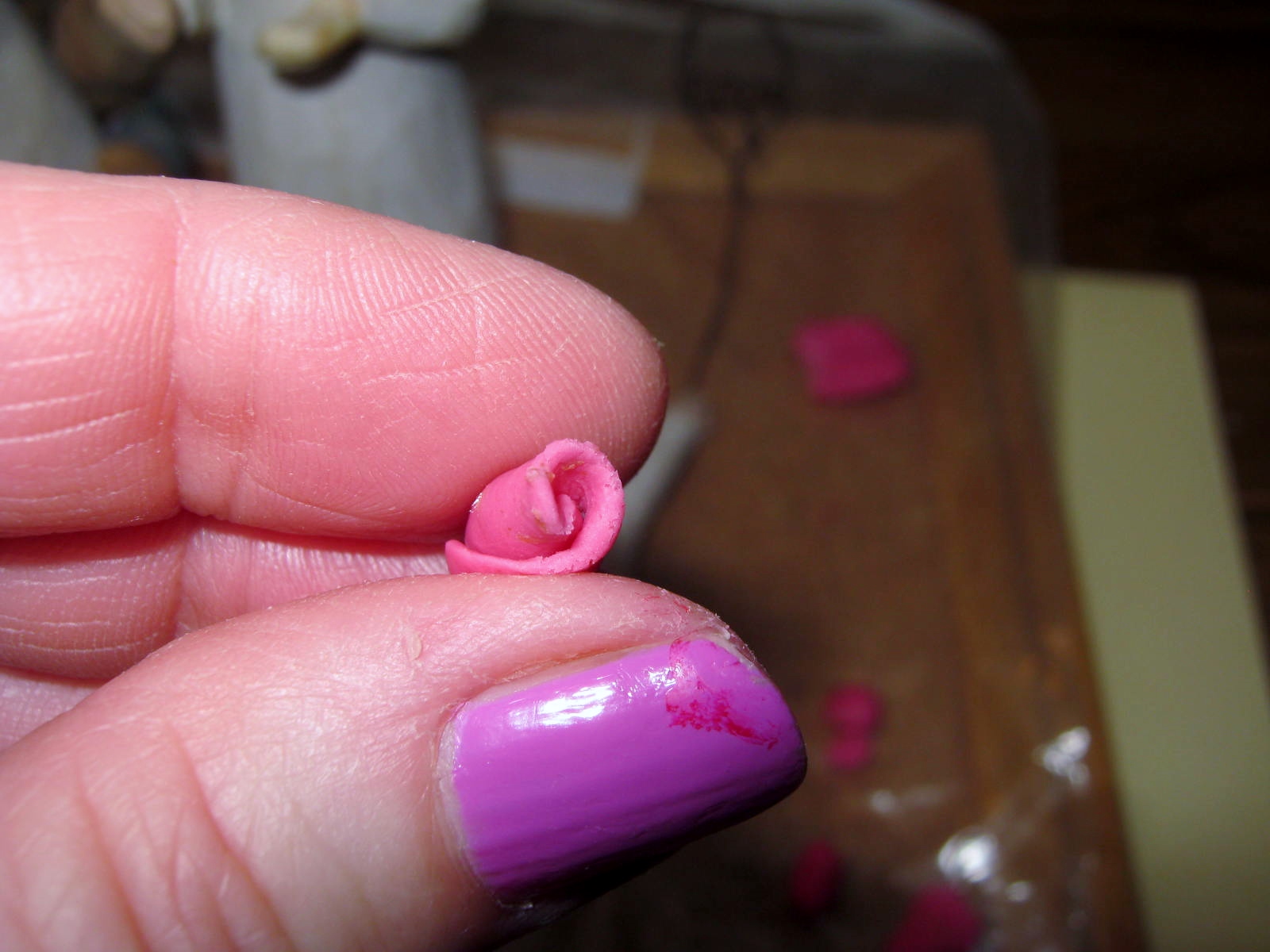 Continue flattening pea shapes, add these in layers until you form the rose. I usually clip off the bottom with scissors to help the finished rose lie flat.