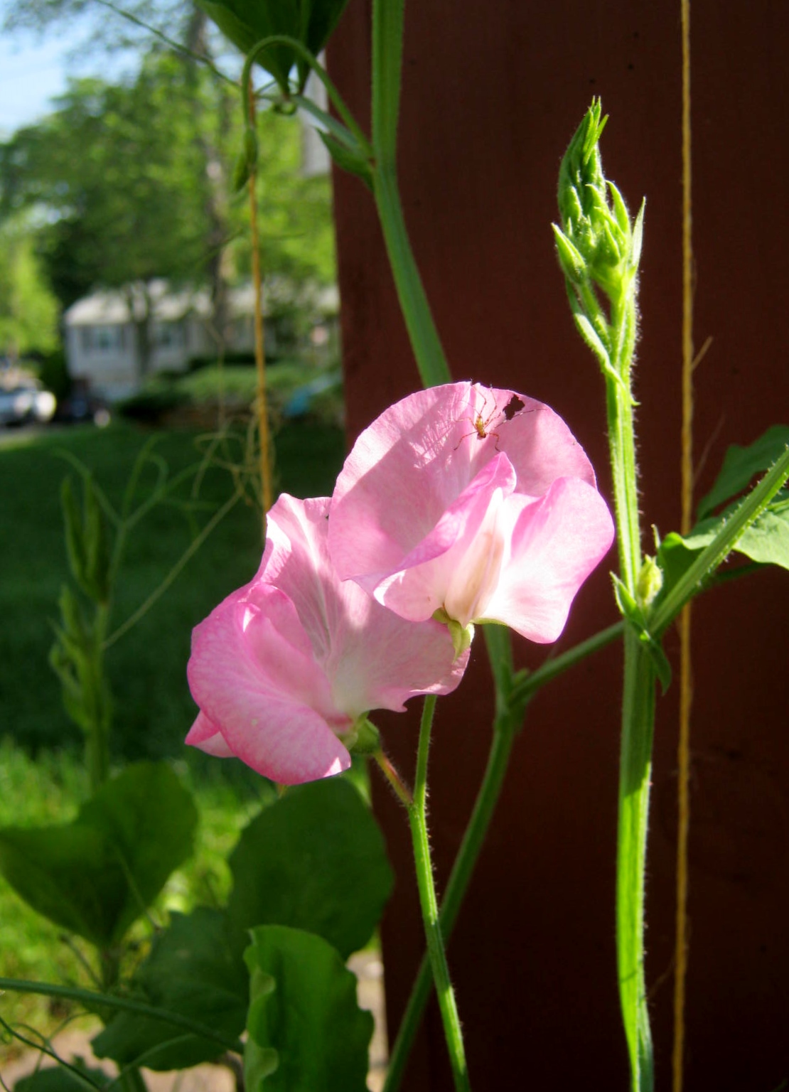 I find sweet peas tricky to germinate and grow. This year only three seeds sprouted and grew to a good size for me. The three vines are doing a great job climbing up the string I strung alongside a butterfly house.