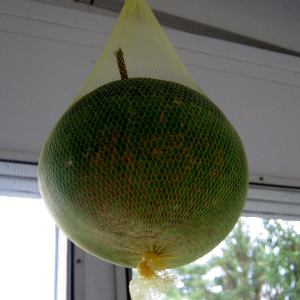 I found good information on How to Dry Large Gourds, but instead of drying for a week on newspapers, I am using a piece of bath scrunchy. (Bath scrunchies are made up of a tube of nylon netting.) I knotted the bottom of the tube, slipped the gourd inside, tied a knotted loop at the top, and hung the gourd on a porch hook. The weather is supposed to be warm next week, suspending the gourd will give the entire skin a chance to dry out.