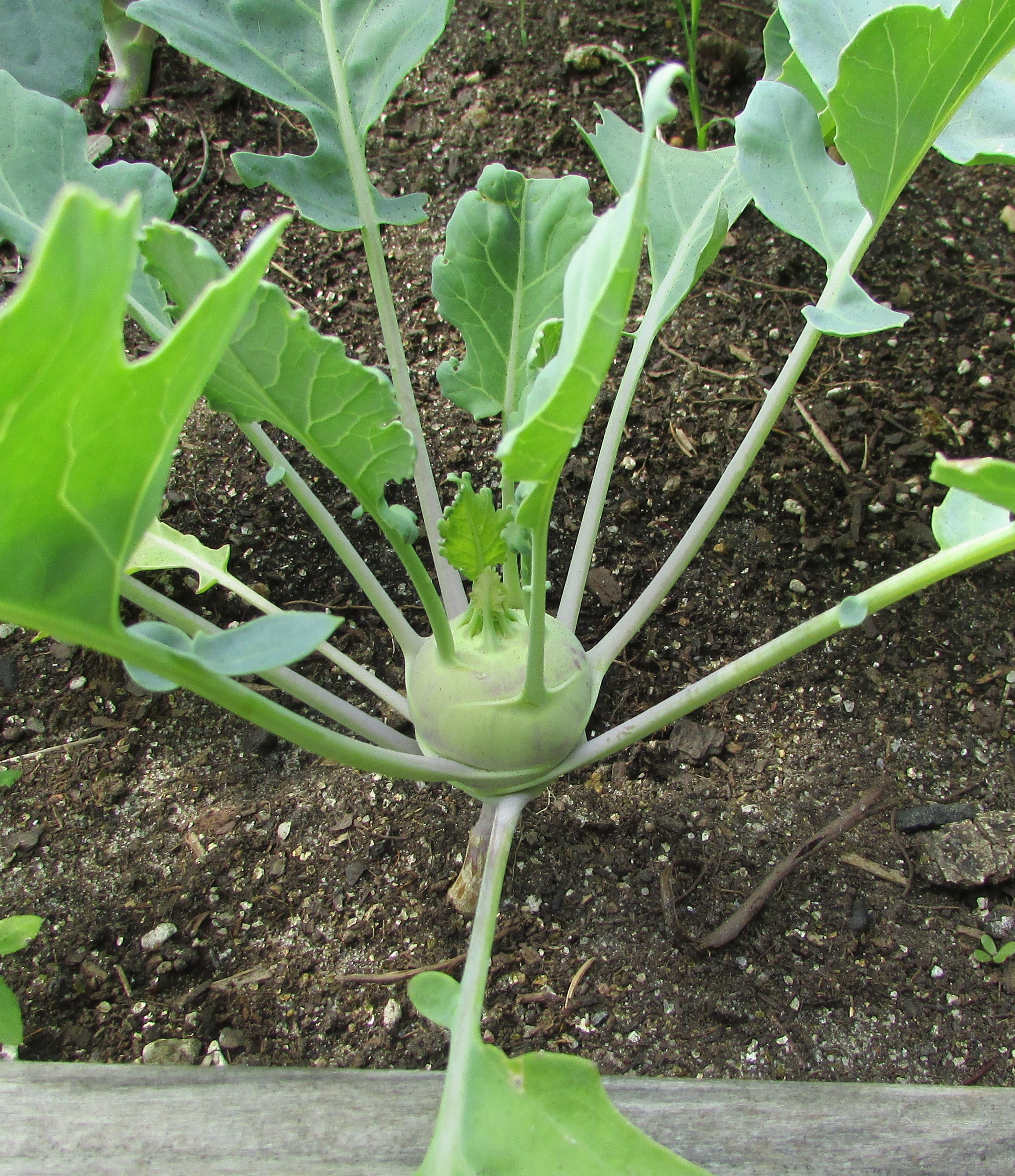 Kohlrabi! Who knew it was so easy to grow? I’ve seen it on seed racks year after year and never tried it. This year I remedied that by planting a free packet someone gave me. I’m excited by the plants that are growing now. I’ve read kohlrabi tastes like a mix of cabbage and broccoli, and can be eaten cooked or raw. It is also recommended as a good addition to soup puree. Kohlrabi leaves can be cooked like mustard greens.
