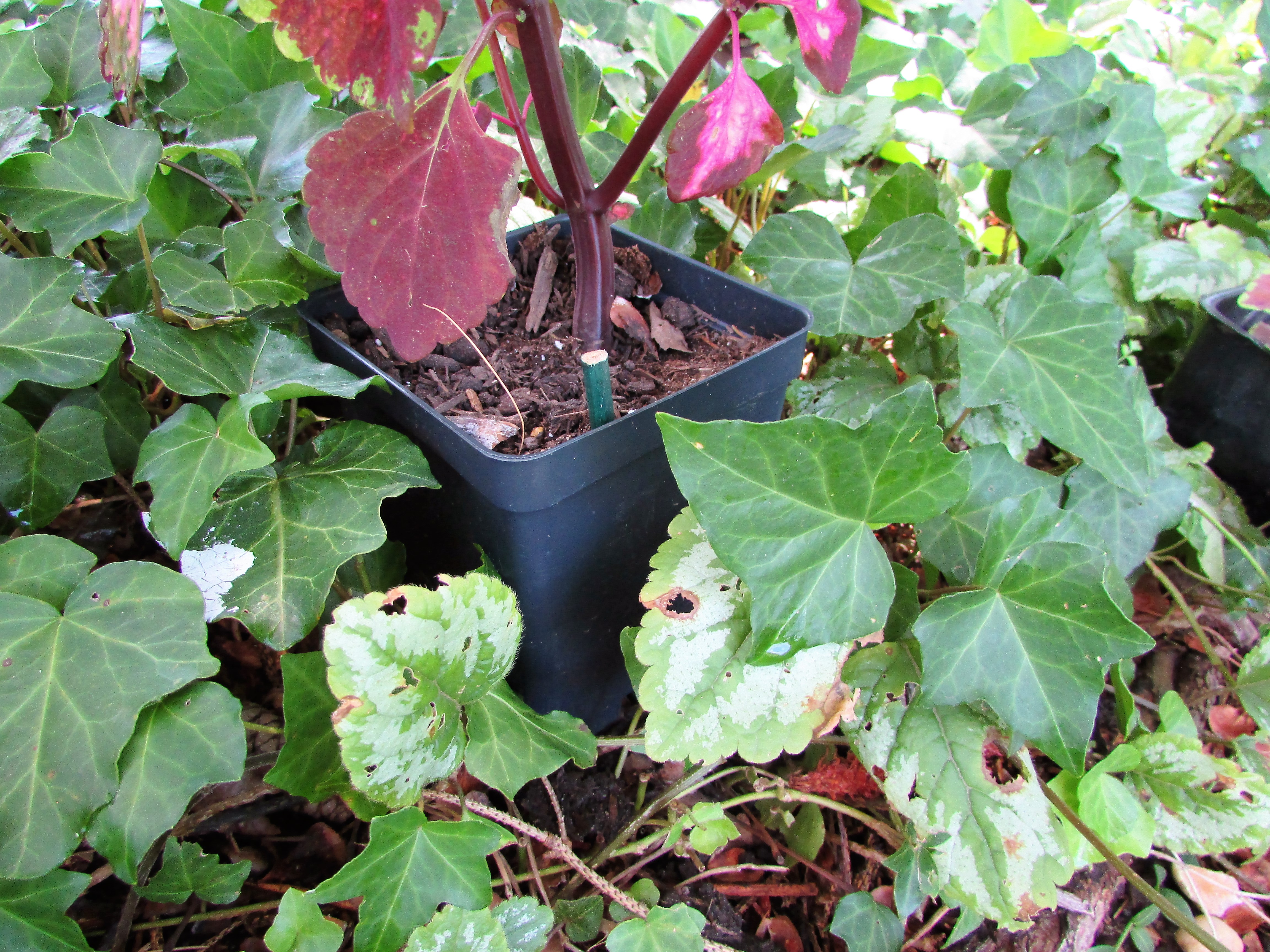 I had a late start growing my coleus from seed this year. To give them a better chance to grow larger, I planted them in pre-fertilized potting soil in pots. My ivy beds beneath the pines were the perfect spot for the pots to sit. The vines were the perfect height and strength to hold the pots in place. Now some of the coleus are nearing twelve to eighteen inches in height. The wind has continually knocked them over in the last few weeks. To stabilize the pots and keep them from overturning I aligned short stakes with the drainage holes and hammered them into the ground. This has worked perfectly, a quick solution to a constant problem. I also thought a dollar store pack of pencils would have done the trick for holding the pots in place. Sharpened, and pounded in through the drainage areas, they would also keep the pots stable.