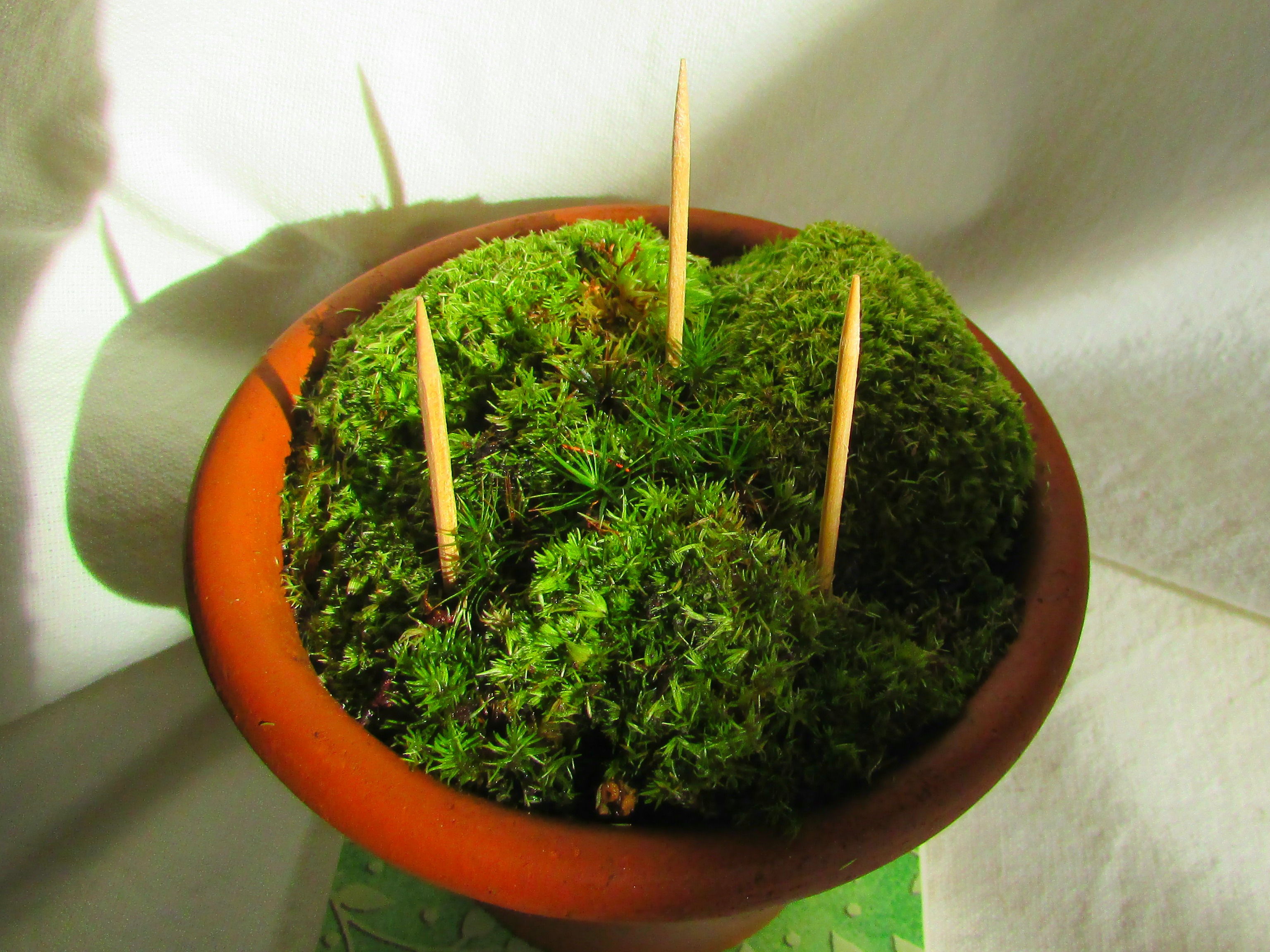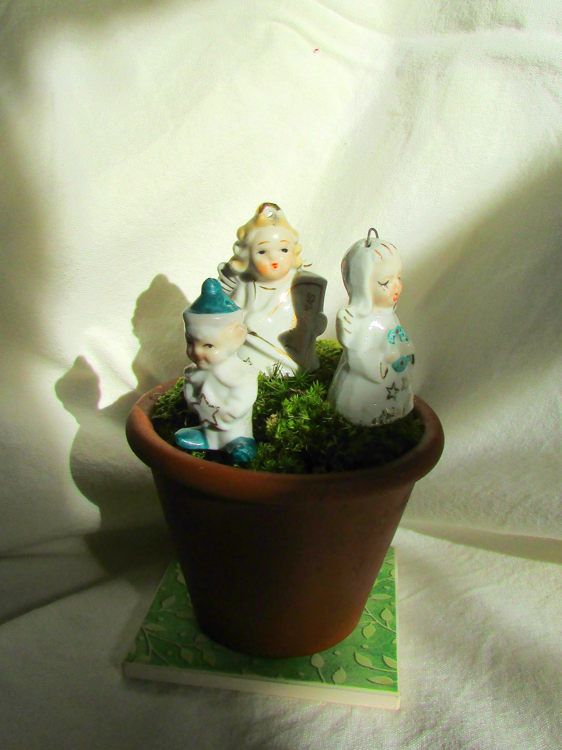I had some moss left over. I didn’t want to waste it so I place it in a terracotta pot, added some toothpicks, and used it to display vintage ornaments.