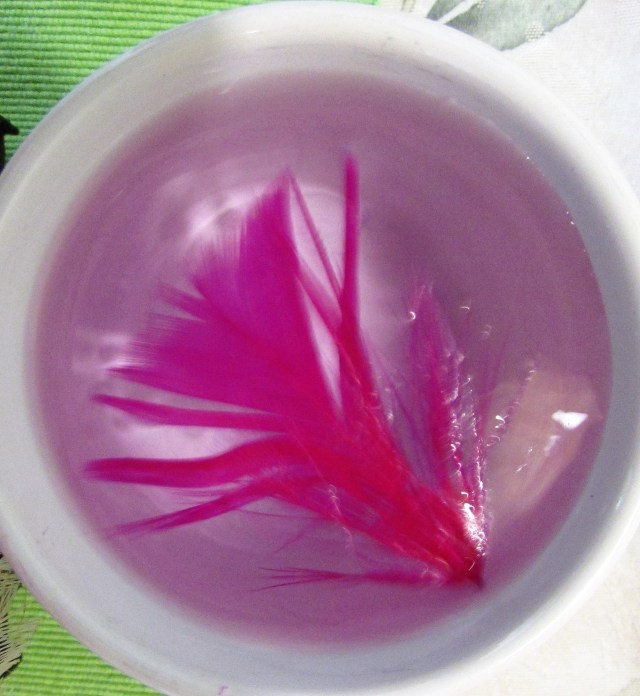 Sure enough, when we soaked a feather the water soon was tinted with excess dye. We pulled out all the dyed feathers and only used natural feathers with no color added.
