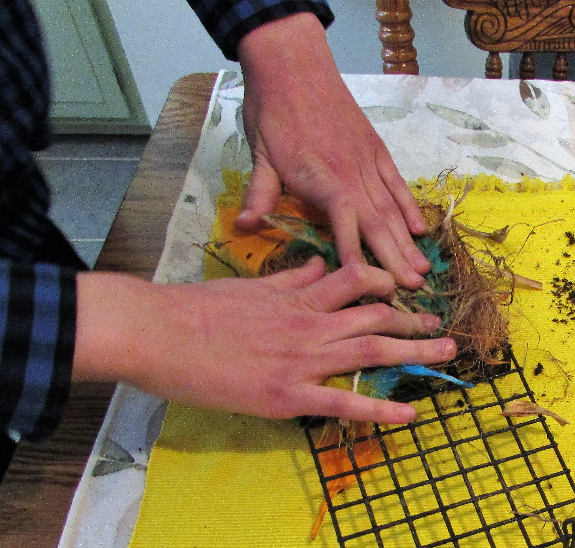 Birds are beginning to forage for nesting material in our yard. My grandsons helped me fill a suet feeder with bits and pieces that the birds might like to use for lining their nests. We were careful to use string that was cut very short. I’ve read a recommendation of no more than six inches long, but we halved that to three inches to be sure baby birds would not become tangled.