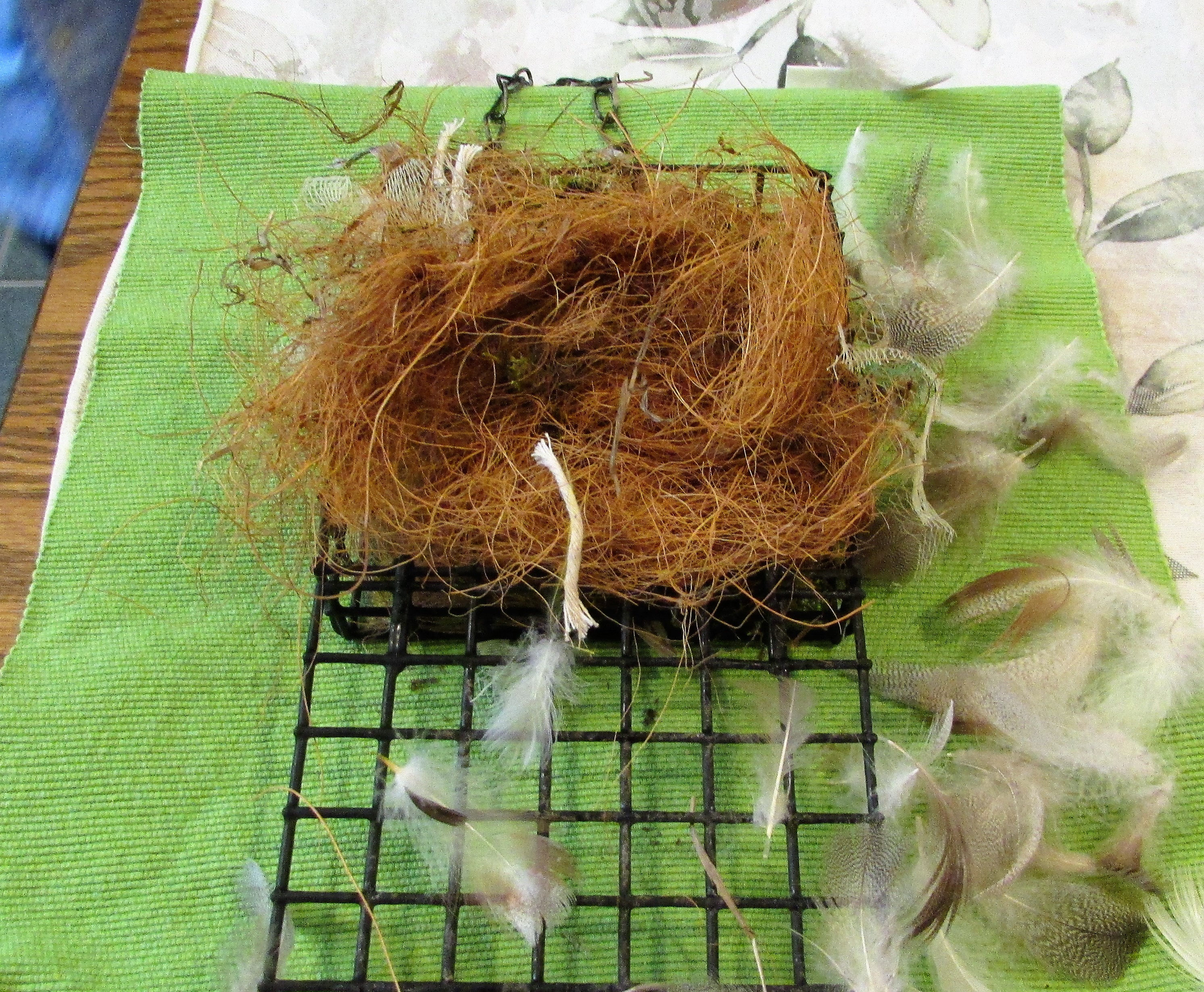 Other items we added were dry grasses cut short, shredded cocoa liner, cotton clothesline casings, bits of tightly-woven nylon netting, and some moss.