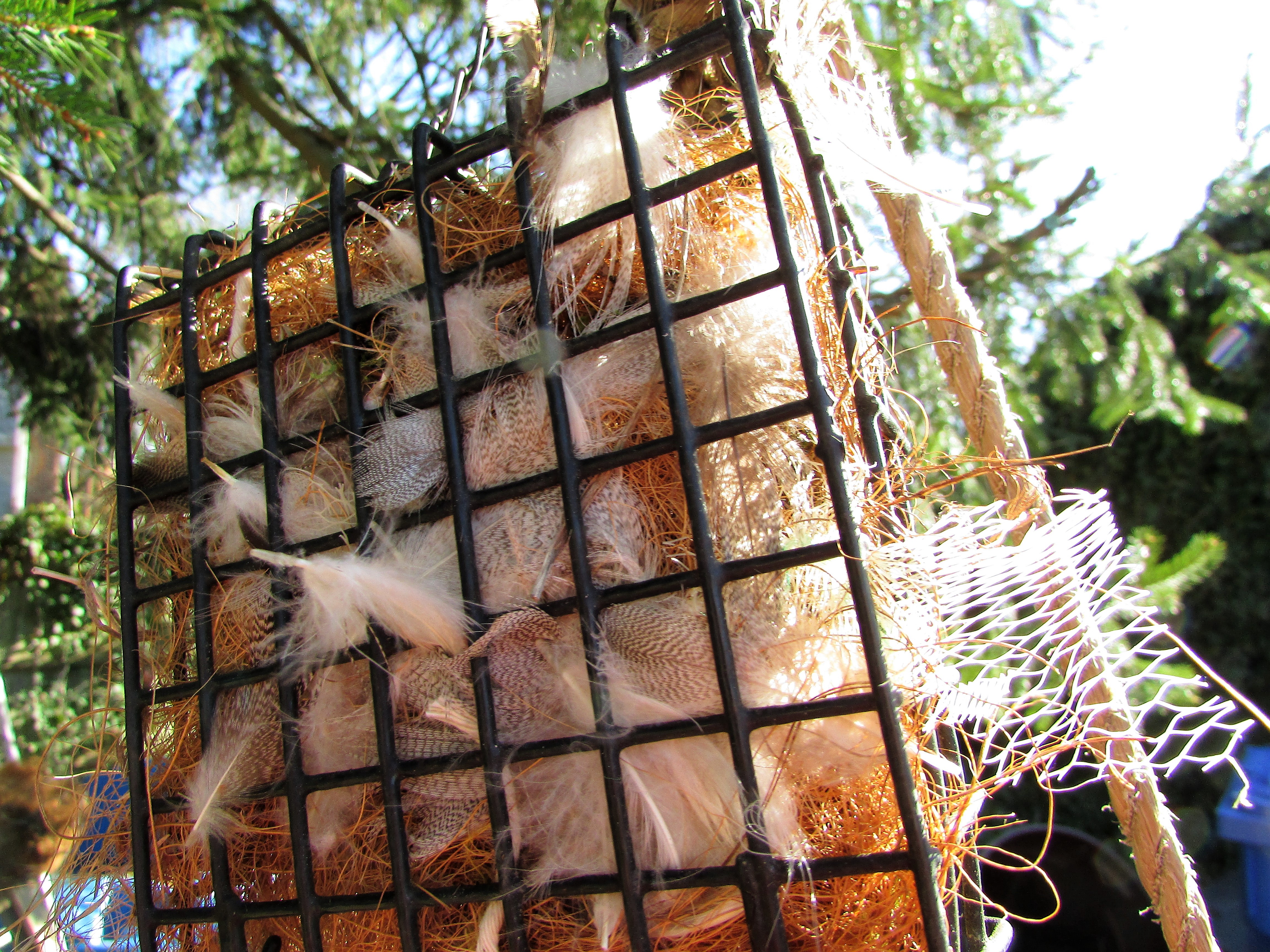 At first we added some colorful feathers in hopes of spotting them within the nests, but then I had second thoughts about the dye they might contain.