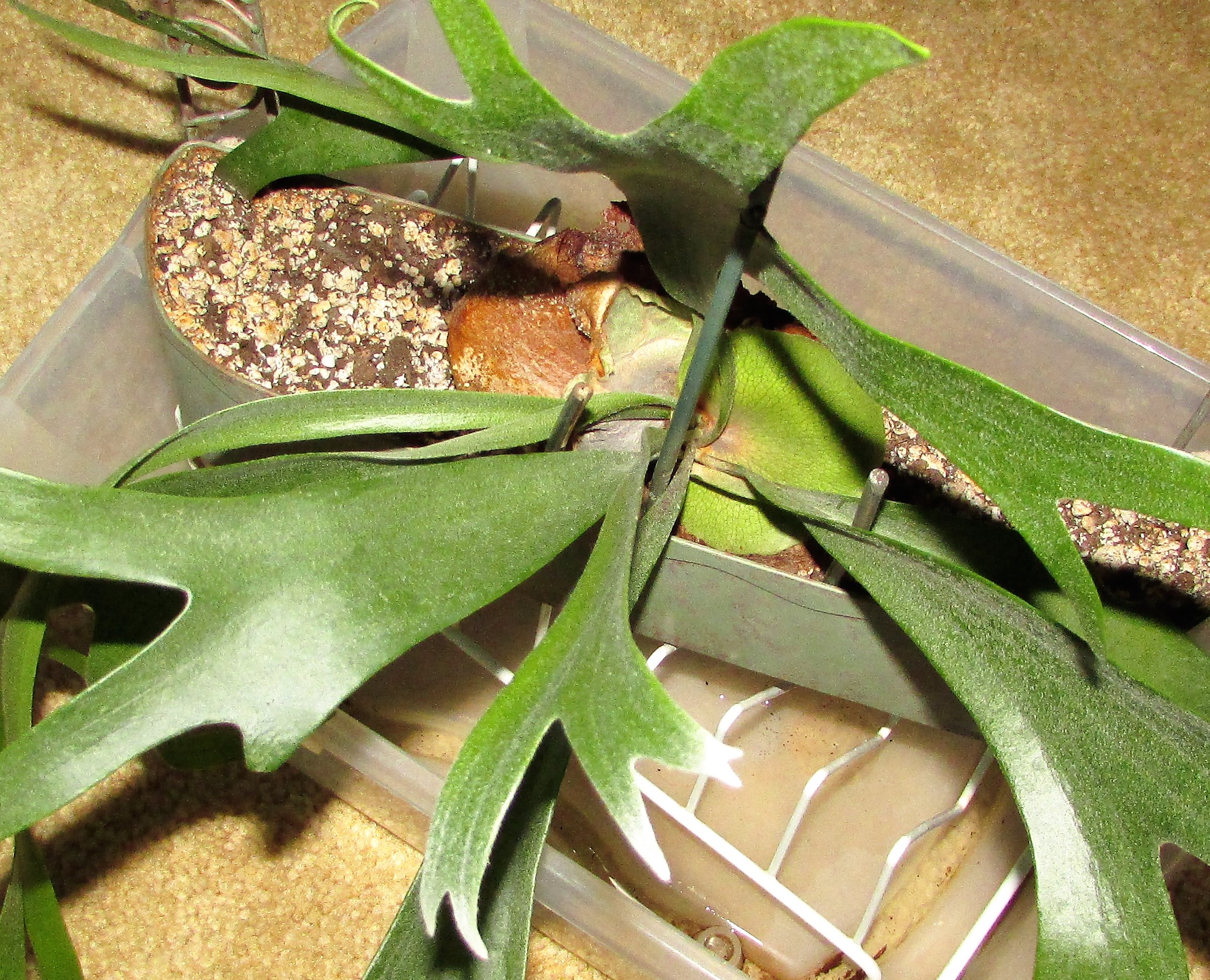 So how does this quick tip end up in the same post as my staghorn fern? Well, my plant watering system allowed me to place the fern on the dishrack and pour two gallons of clean water through the soil. I almost think the whole ordeal did the fern good, it looks better than ever.