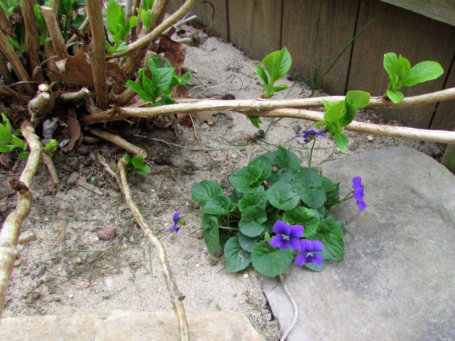 I love violets in the Springtime, not only do they add color, they are gently fragrant and a scent I seek out at this time of the year. Violets self-seed and will pop up in unexpected places, like this one under my hydrangea bush. I have violets everywhere, offspring of the dozen or so I transplanted from the creek bed years ago.