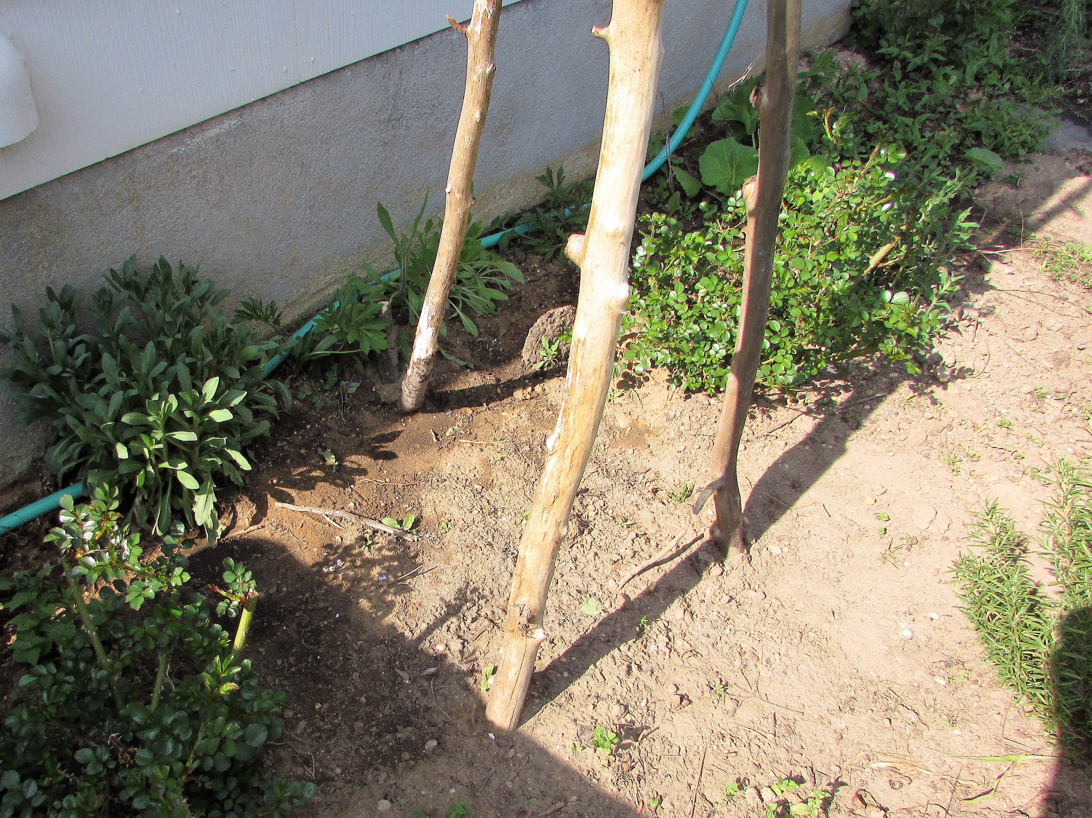Fallen branches create an easy and secure tripod for a bird house. The bottoms are stabilized by placing them about ten inches in the ground. The top of each branch leans against the others securely fastened with floral wire and leather ties. The bird house rests within the three branches and is secured with floral wire and leather through screw-eyes attached to the bottom of the house.