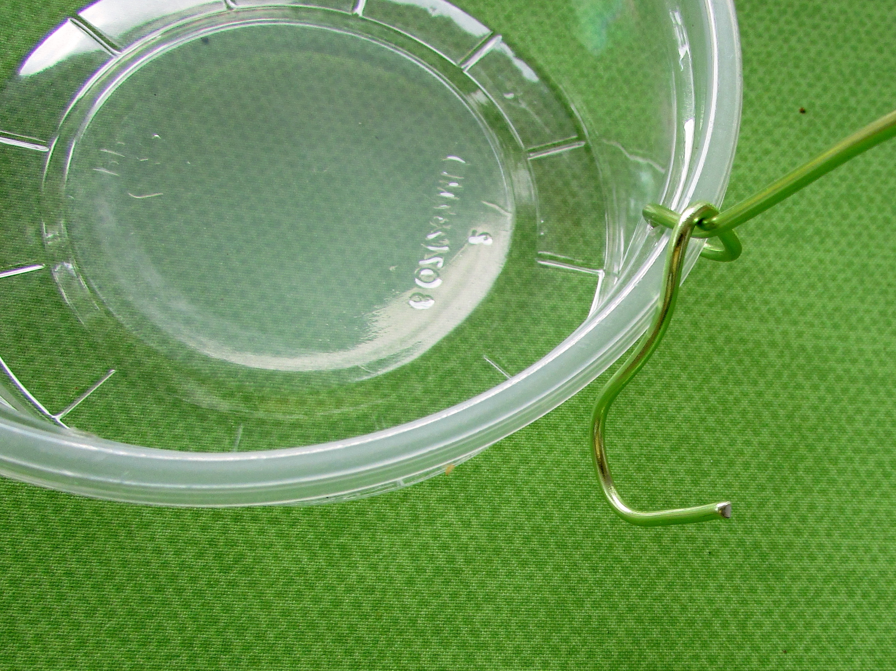 No instructions needed, use what you have on hand. The secret lies in the wire and plastic container: a plastic dish scrubber. The butterfly can land on this and use his long proboscis to dine on the nectar. I created holes in the plastic dish with a hot ice pick.
