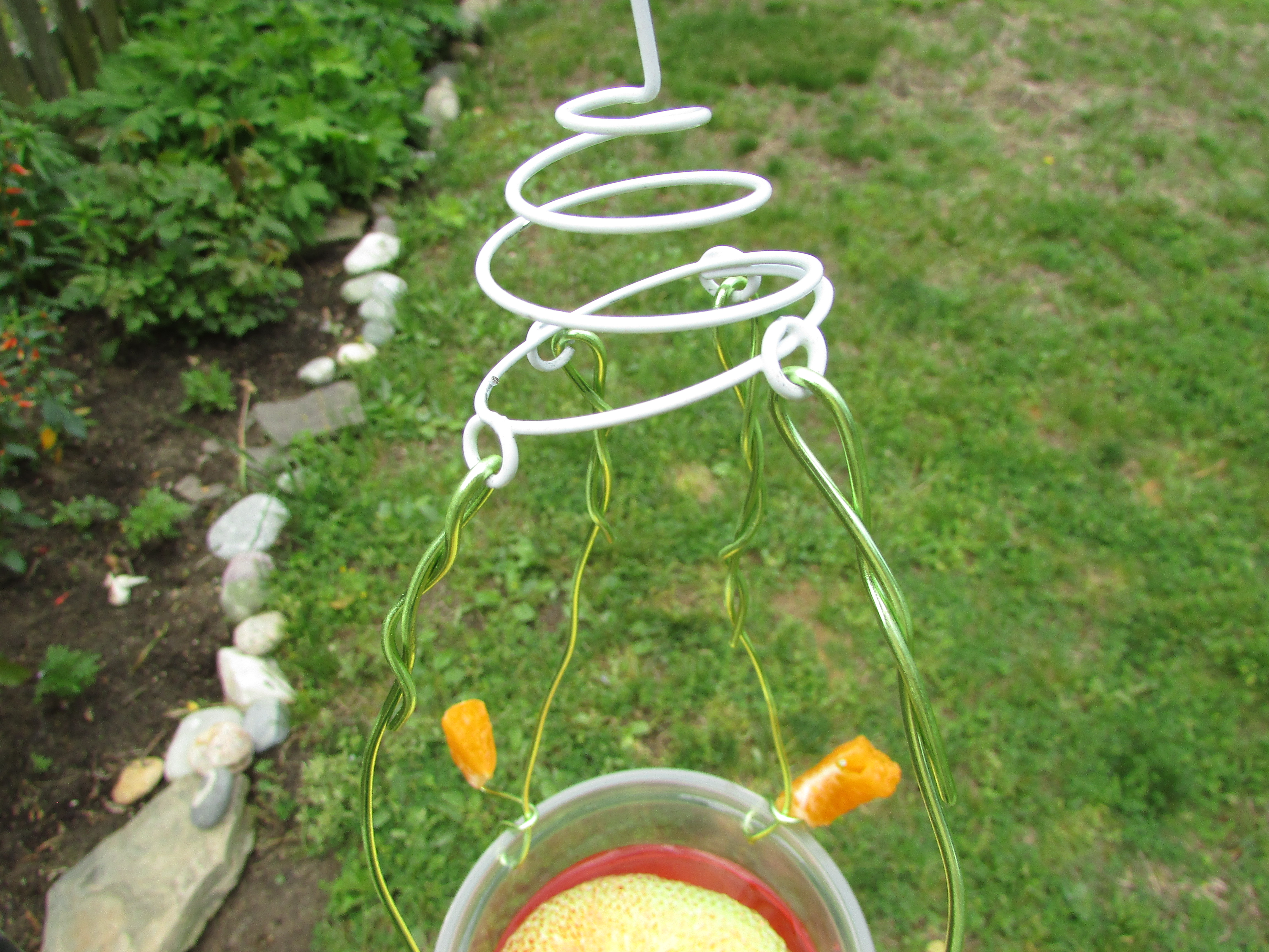 When I added the wire for hanging I let the end curl upward. These make the perfect spear for rotting/old fruit. I was going to use a strawberry, but remembered they are heavily sprayed with insecticide. It is better to use fruit that is within a peel unless it is organic.