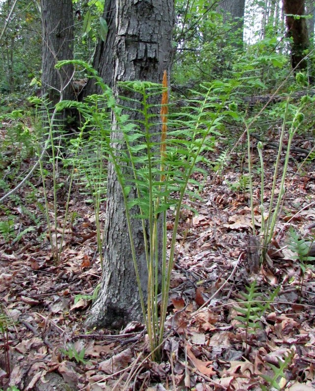 “The Osmundastrum cinnamomeum fern forms huge clonal colonies in swampy areas. These ferns form massive rootstocks with densely matted, wiry roots. This root mass is an excellent substrate for many epiphytal plants. They are often harvested as osmunda fiber and used horticulturally, especially in propagating and growing orchids. Cinnamon Ferns do not actually produce cinnamon; they are named for the color of the fertile fronds.”