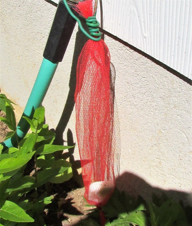 1. Are your hands too dirty to even touch the doorknob to get into the house? A net bag, think onions, potatoes etc., can be a terrific outdoor soap receptacle. I used some of my favorite flexible garden ties for this tip, wrapping the bag and attaching it to the hose spigot with the same tie.
