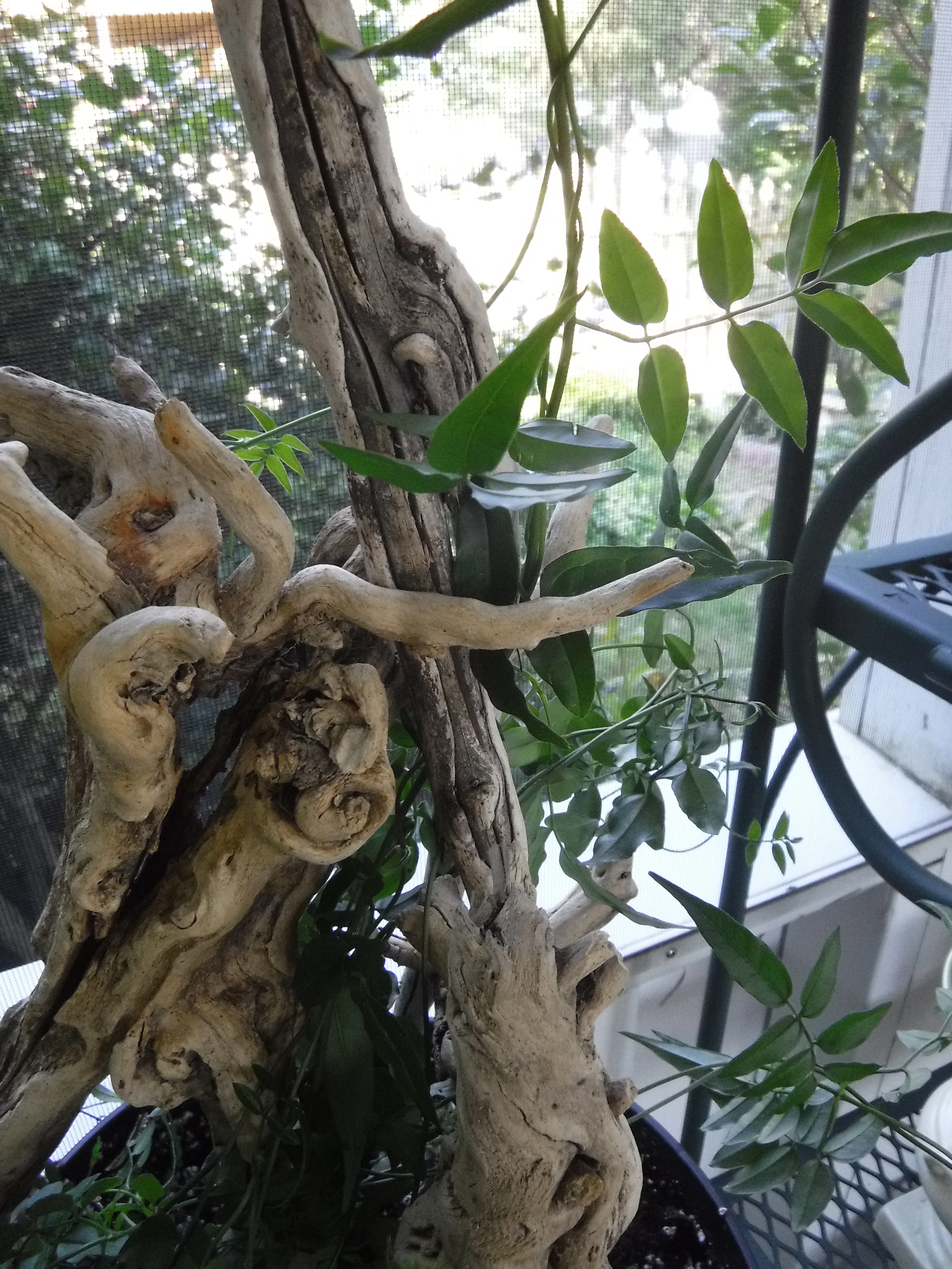 I used four pieces and inserted them in the potting soil root end up. The longest branch was placed in the center, the three shorter branches support the center piece tripod fashion. The gnarly roots were pliable and easy to maneuver around the center branch for even better stability. I like the natural look this trellis creates. Now I need to work on replacing the plastic pot with an ascetically compatible container.