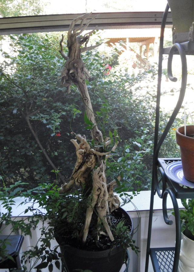 A natural trellis for a very unruly jasmine plant was my first driftwood project. I don’t know if I should title the activity a project, it was more of a planting. These taller lengths are the trunks of small trees with gnarly roots still attached. Because branches don’t have the same appeal to beachcombers as the smaller pieces, they tend to become very aged and gnarled, beautifully bleached by sun and salt.