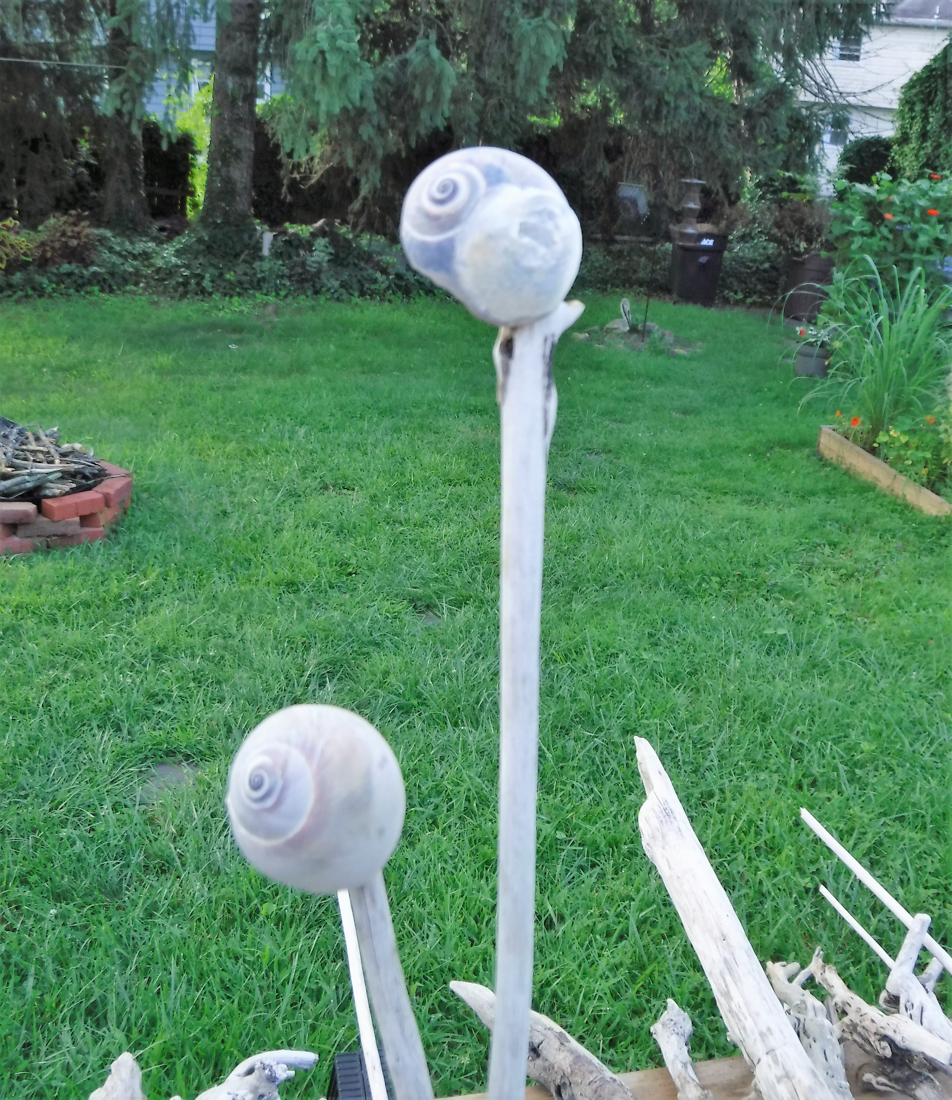 Thankfully, the fix is easy for my houseplants. To go with the seashore theme of the driftwood I placed a few small moonshells over the end of the plant stakes. Anything will do as a protective piece, a bead, string wound around the tip, a drilled acorn or nut, clay fashioned into small birds, the possibilities are almost endless.