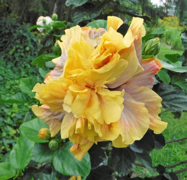Several of my favorite plants have been found in the unlikeliest places. I discovered this beautiful hibiscus for sale in a local deli. It wasn’t blooming when I bought it; I assumed it would have the appearance of a typical garden shop hibiscus. What a surprise awaited me when the multi-hued double petals opened for the first time. In the Autumn, I will bring the plant indoors and try to keep it alive and blooming for years. At some point I know I will have to capture this flower in watercolor.