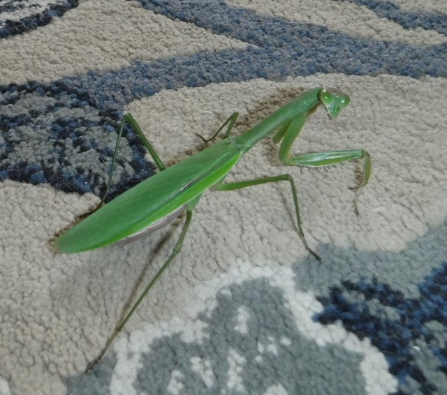 I gently took her indoors to show my cat. He is a scaredy-cat so I knew the mantis was not in jeopardy.