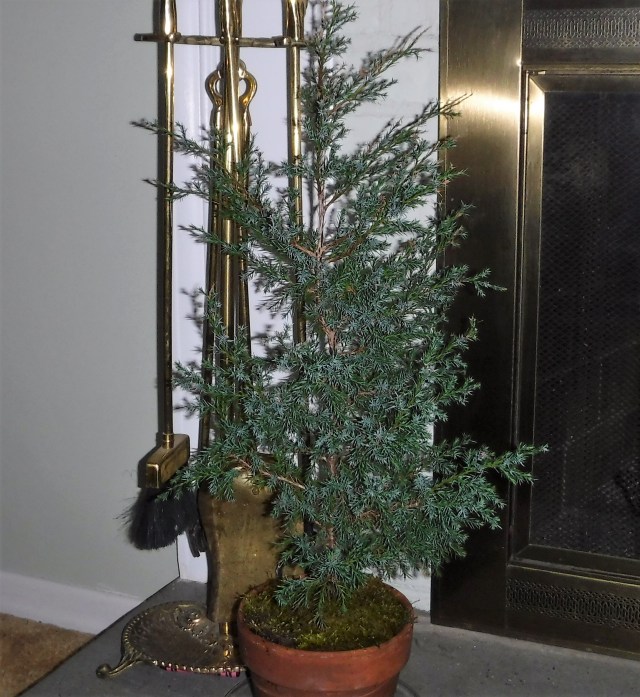 Today, I searched my yard on the edges for some moss, that if taken, would not leave a noticeable scar. I found a bit, and placed it around my scrub pine Christmas tree, transplanted once again, this time in terracotta. I have loved this little pine so much, that even without its pretty ornaments, I cannot put it outdoors in the wintry mix of weather that will surely assail us soon. I’m keeping it! In my studio, I feel a need to decorate it again, this time with small birds. Updates will follow.