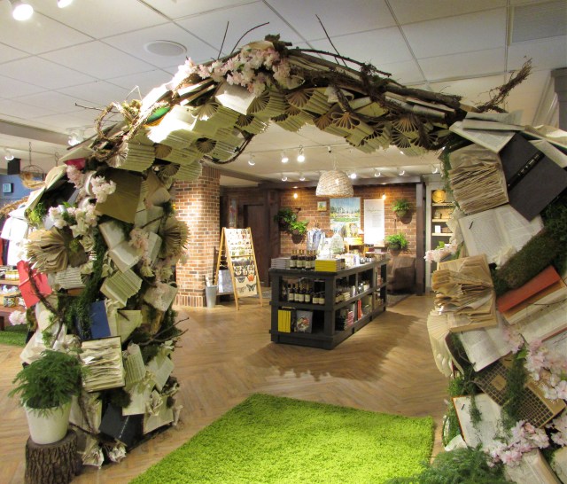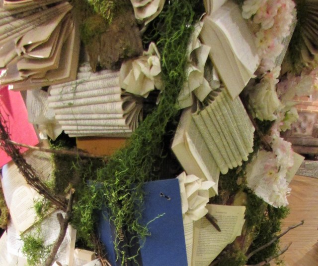 On a recent trip to Longwood Gardens we admired this arch created with books folded into interesting shapes and flowers. The base appears to be created with gnarly branches and moss.