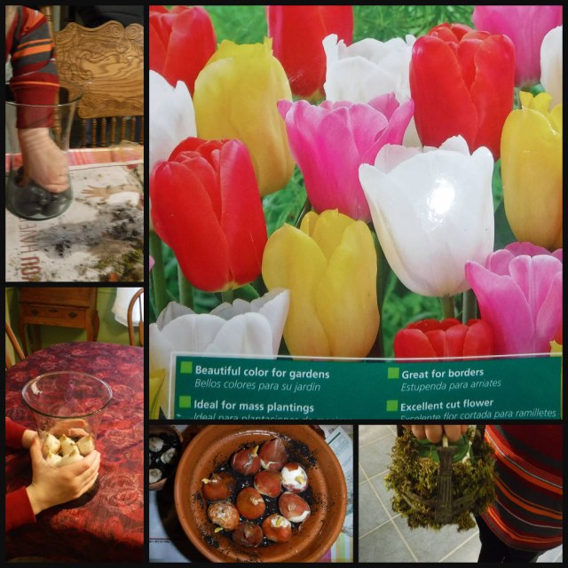In November I posted on clearance aisle tulip bulbs stored in my refrigerator drawer among the carrots and other vegetables. This weekend, to break up another monotonous winter day with hopes of Spring, my youngest grandson helped me begin to force the bulbs. The tulips are in a mixed-colors package. Although we might speculate about which dreamy colors will unfurl, it’s totally a matter of chance as to color combination.