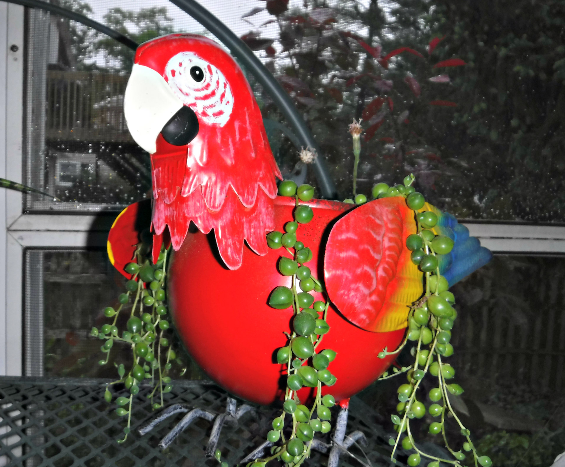 The succulent is a perfect fit for this bright parrot planter. The planter has held several plants, but none so well suited to it as the String of Pearls and its cascade of bright green beads. I also love the flower the plant produces, a small white orb with brilliant stamens. The String of Pearls blossom is my Flower of the Day.