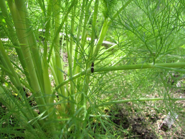 The fennel survived the winter and is a cloud of softest, hazy foliage in the Square Foot Garden. I was admiring it when I spotted a contrasting strand of something black on the foliage.